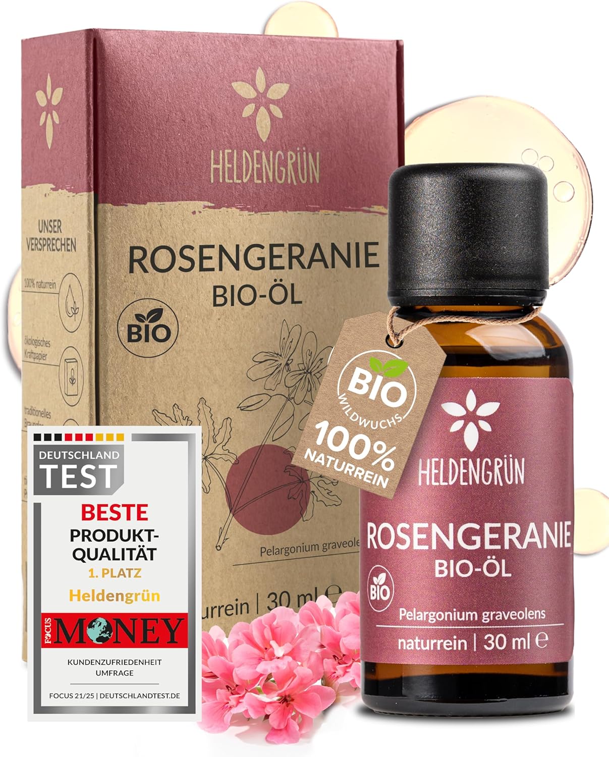 Heldengrün® BIO Rosengeranienöl ist ein ätherisches Öl auf Basis von Geranium mit einem Duftprofil, das laut Hersteller an frisch geschnittene Rosen erinnert. Es richtet sich vor allem an alle, die sich einen natürlichen, blumig-eleganten Geruch für Kosmetikrezepte oder fürs Raum- bzw. Aromatherapie-Ambiente wünschen. Getrieben wird das Ganze durch Bio-Anbau in Griechenland und die schonende Herstellung per Wasserdampfdestillation.