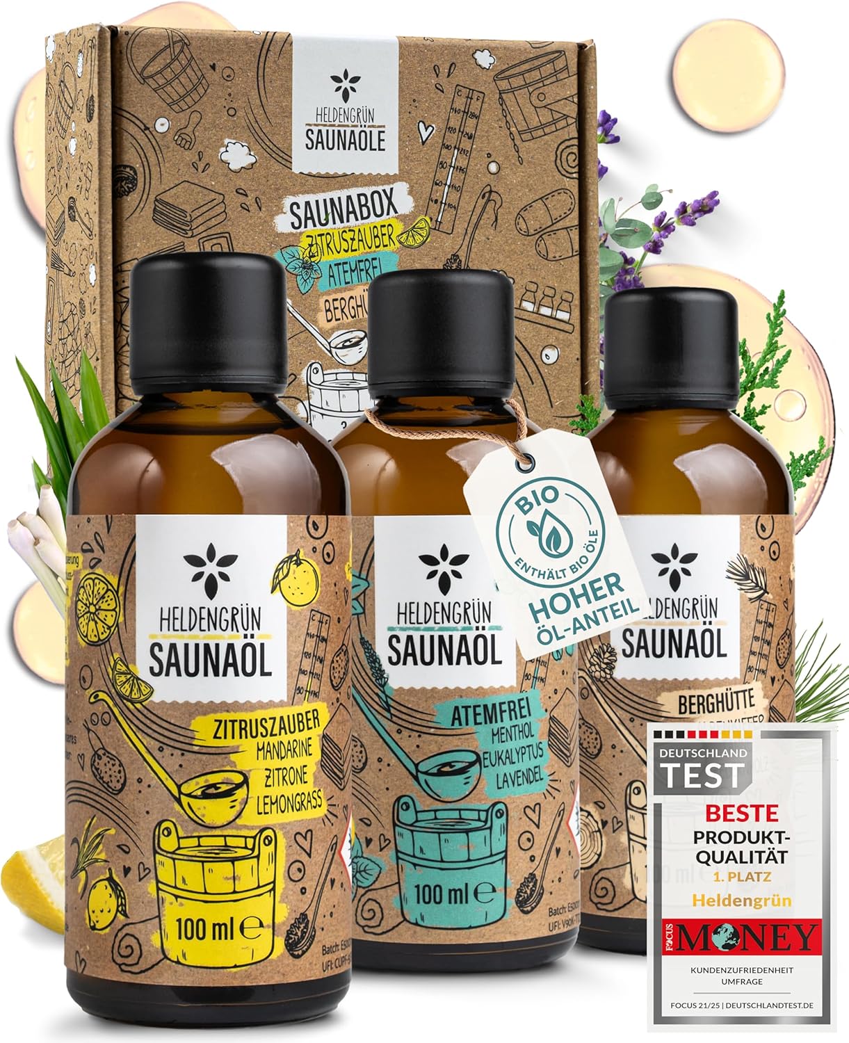 Heldengrün® BIO Saunaaufguss Set – 3er Duftmix mit ätherischen Bio-Ölen für bis zu 60 Anwendungen