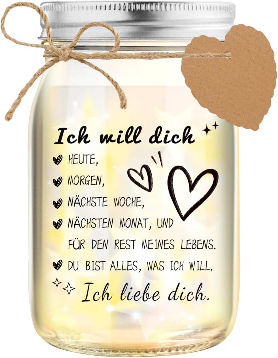 - Verpackungsinhalt (laut Beschreibung): Glasflasche, LED-Lichterkette, Herz-Anhänger, 50 goldene Kordel-/Bänder, Sternpapier, 4 Wunsch-„Listen“, Stück Jute-Schnur