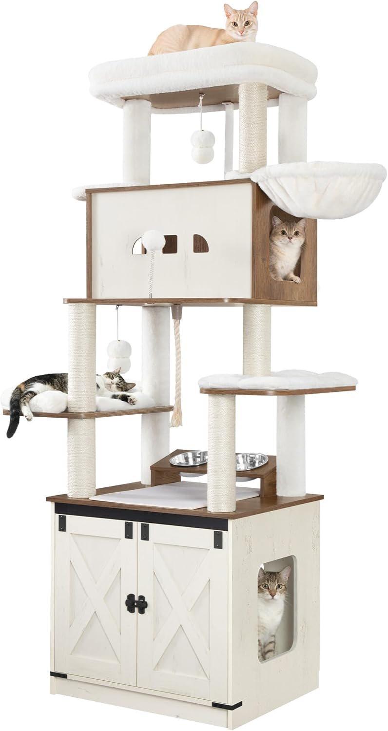 Wenn du Platz und Ruhe kombinieren willst, kann dieser Kratzbaum helfen. Hzuaneri CB89014WT bietet eine erhöhte Futterstation über dem Katzenklo, so bleibt das Futterbereich sauber und Hunde kommen nicht so leicht daran. Beachte, dass die Tür des Katzenschranks abschließbar ist, was zusätzliche Sicherheit gibt. 🥣