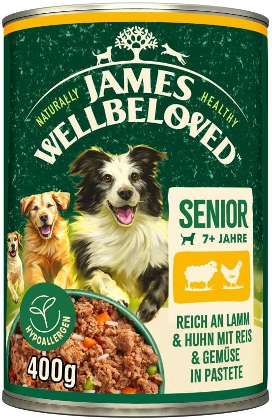 Wenn dein Hund im Senior-Alter ist und du gleichzeitig auf Zutaten achten möchtest, die möglichst wenig typische Allergie-Auslöser enthalten, ist dieses James WELLBELOVED Nassfutter in Pastete als Ansatz gedacht. Es kommt als Dose (insgesamt 6 Stück) und setzt dabei auf eine Mischung aus Lamm & Huhn.