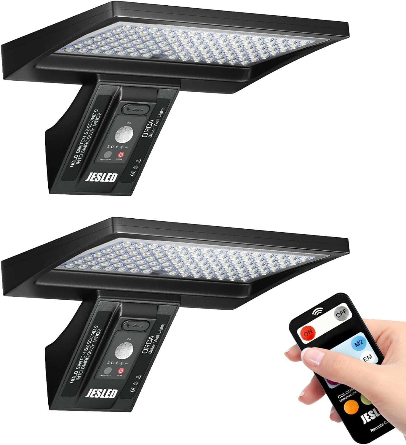 - JESLED Solarlampen für Außen mit 90 LEDs, Bewegungsmelder und 4 Modi (IP65), austauschbarer Akku – 2er-Set