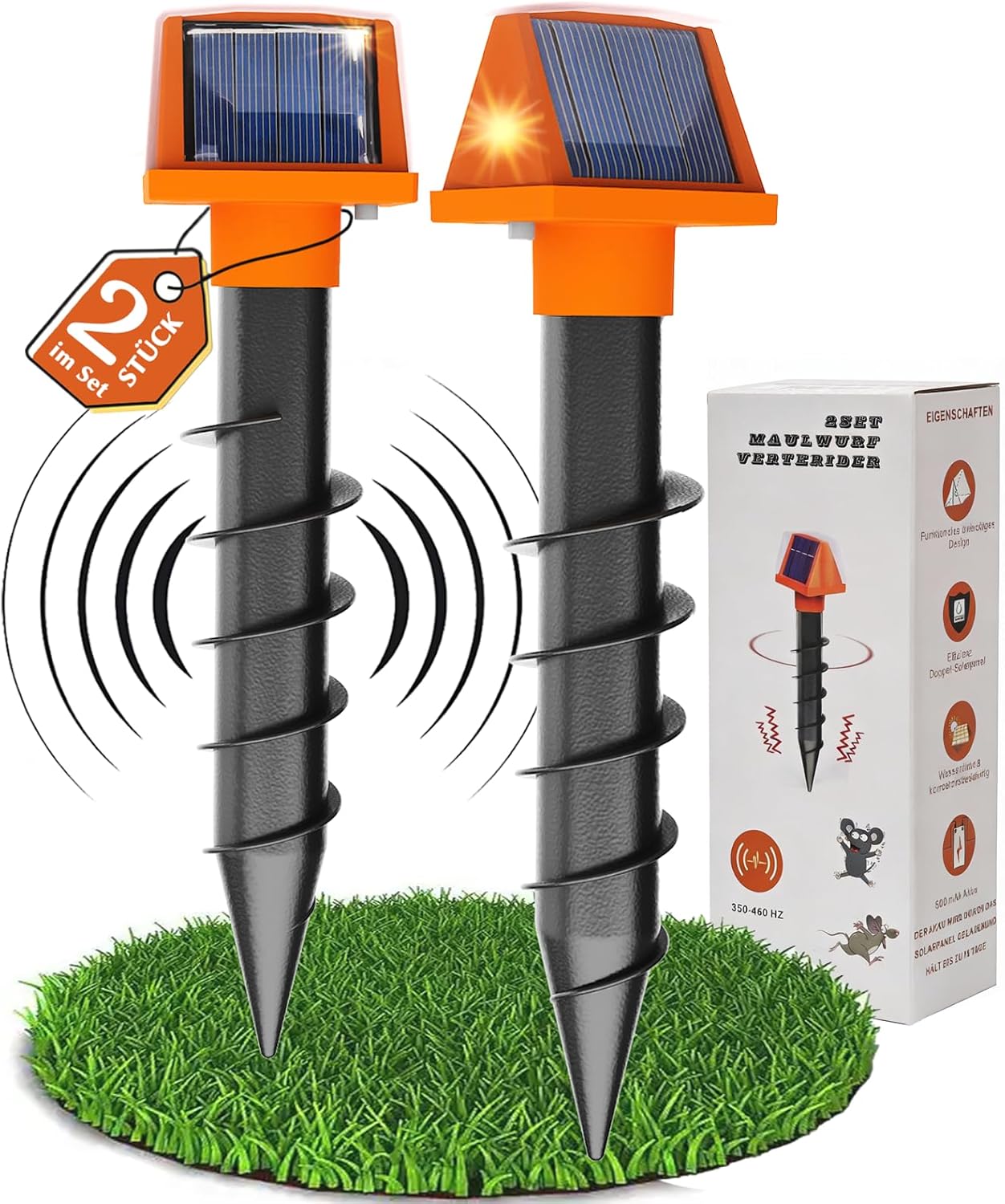 Der Jiraewh Maulwurf Vertreiber 2 Stück ist ein Solar-betriebenes System, das Maulwürfe und Wühlmäuse über die Einwirkung von vibriations- und tonbasierten Impulsen stören soll. Laut Hersteller werden die Signale in bestimmten Intervallen über den Boden in den Laufwegen ausgesendet, wodurch die Tiere das Gebiet meiden sollen – ohne Gift und ohne klassische Fallen im Garten.