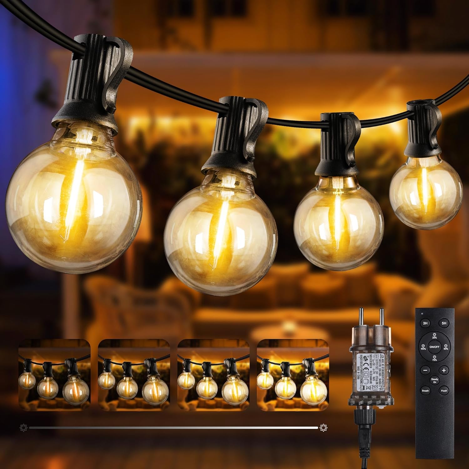- Bowfar Außen-Lichterkette mit G40-Glühbirnen, 15 m, IP68, dimmbar & mit Fernbedienung (23+2 Stk)