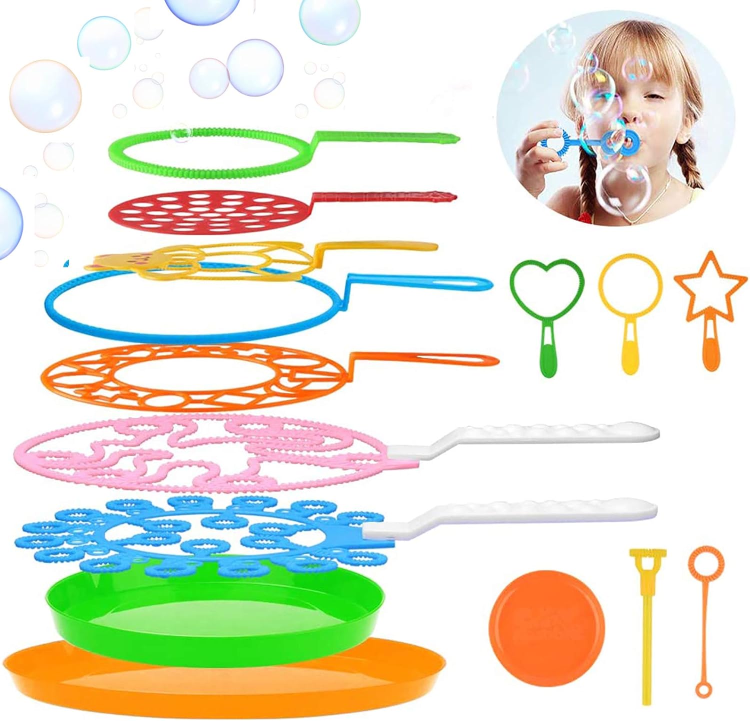 Dieses Set besteht aus hochwertigem Kunststoff und ist ungiftig, damit blasenfreundliches Spielen auch von älteren Kindern sorglos genutzt werden kann. Die einzelnen Stäbe kommen in bunten Farben und bieten unterschiedliche Größenoptionen, damit Kinder verschiedene Blasenformen entdecken können. Im Lieferumfang befinden sich 3 große Blasenstäbe, 6 mittlere Stäbe und 6 kleine Stäbe, insgesamt 15 Stücke, die sich durch einfache Handhabung auszeichnen. Die größten Tools messen circa 7,1 x 11 Zoll, die mittleren etwa 7,1 x 10,5 Zoll und die kleinen Stäbe rund 3 x 3 Zoll. Die Blasenstäbe sind robust, fassen sich angenehm an und sind speziell für lange Spielzeiten konzipiert. Bitte beachten Sie, dass Seifenblasenlösung separat erforderlich ist und nicht im Lieferumfang enthalten ist. Für sicheres Spielen sollten Blasenwasser und Blasenlösungen außerhalb des Mundes der Kinder gehalten werden.