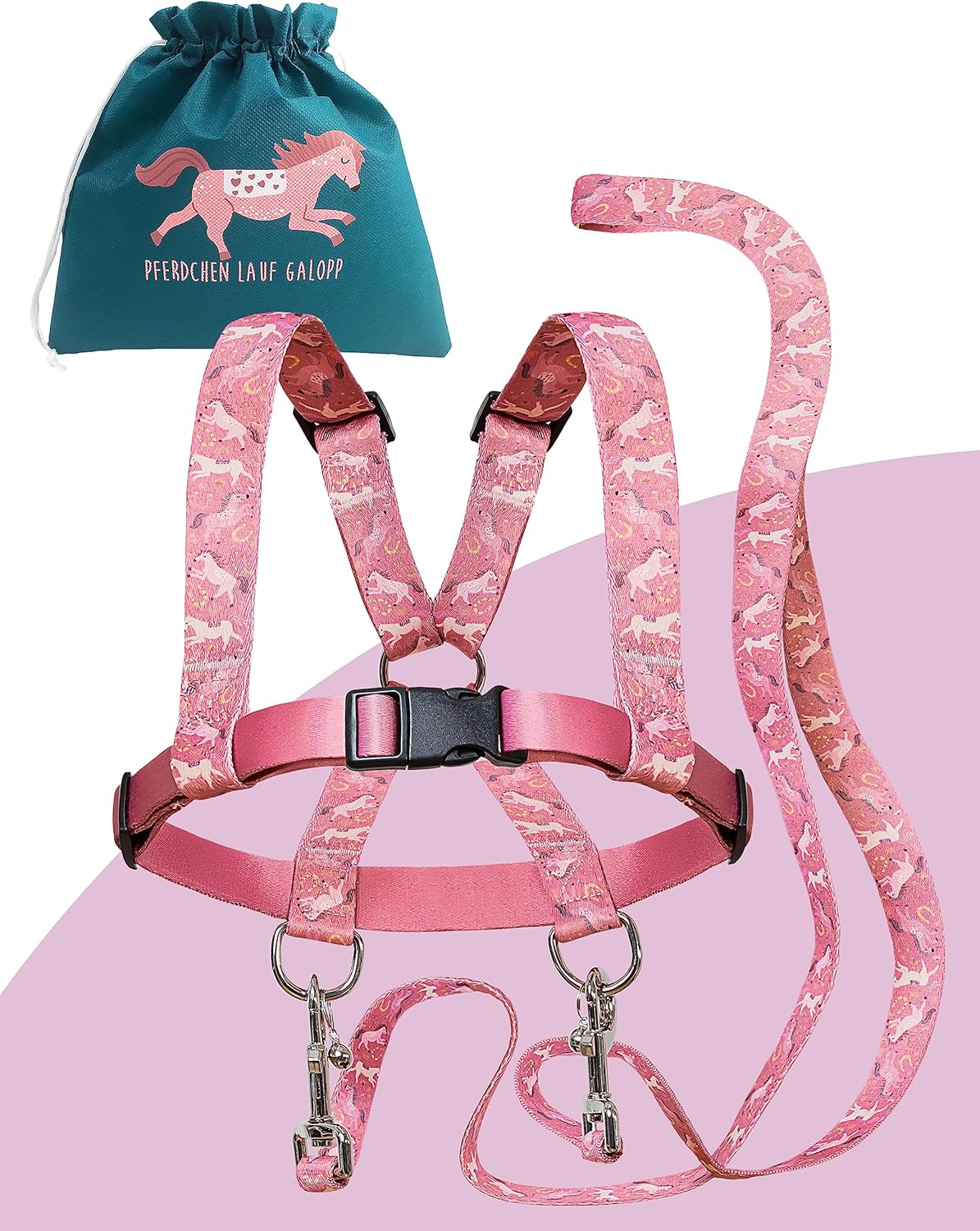 Die Jubi® Rosa Pferdeleine für Kinder ist eine Leine für das Pferde-Spielzeug bzw. fürs „Pferd mitnehmen“ im Alltag der kleinen Reiter. Der Ansatz ist dabei ziemlich klar: Kinder sollen die Leine möglichst selbstständig an- und ablegen können, ohne dass ständig ein Erwachsener nachhelfen muss. Dafür gibt es eine Vorderseite mit Verschluss und einen Aufbau, der laut Beschreibung ein Verrutschen an den Schultern verhindern soll.