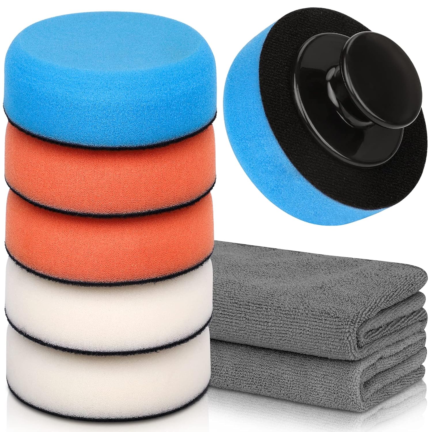 Kasauber Hand Polierschwamm Auto Set Profi 100 mm – Wachs-Applikator-Pads mit Griff & Mikrofaserpoliertüchern
