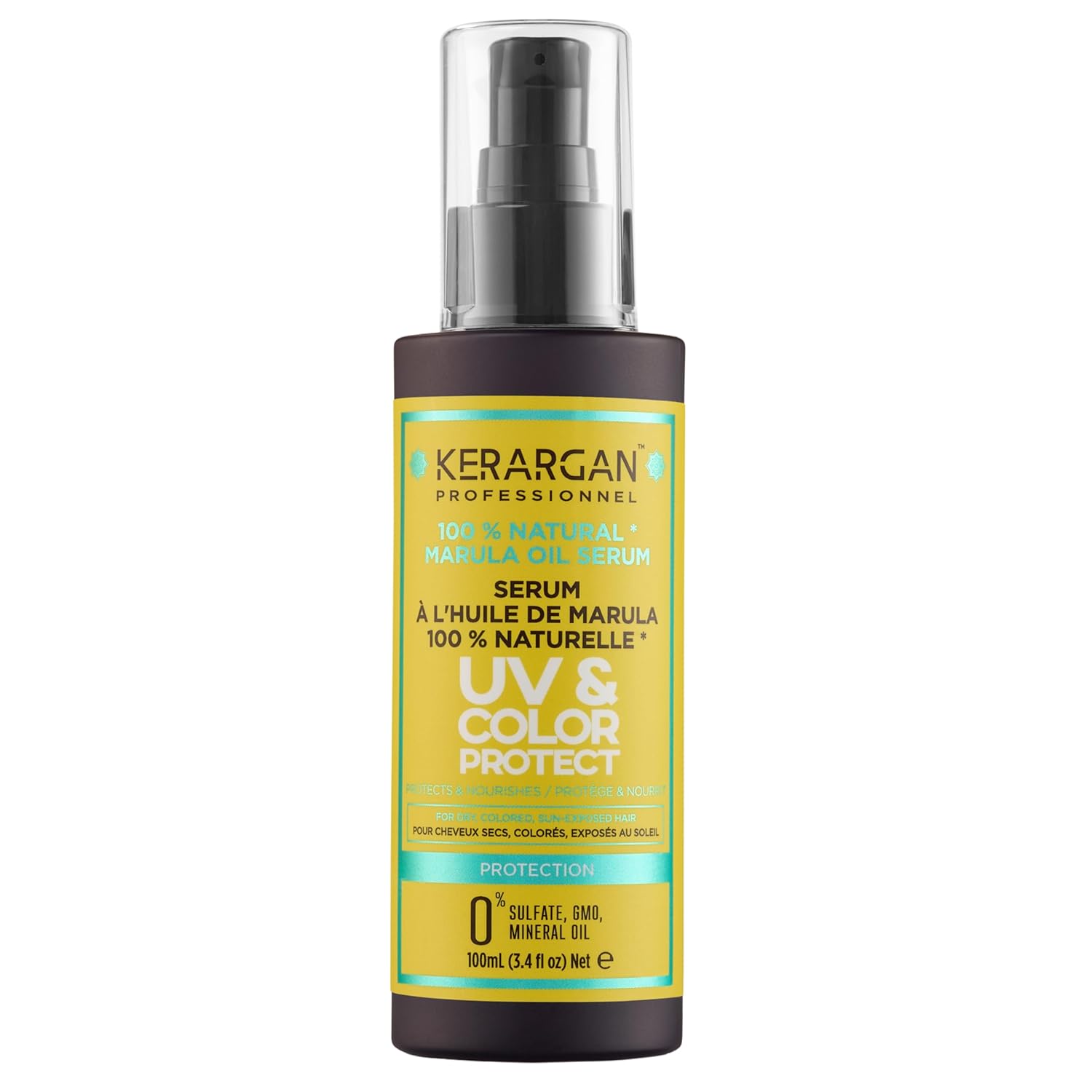 Das Kerargan UV- & Farbschutzserum ist ein leichtes Pflegeöl für trockenes und gefärbtes Haar, das Glanz und Geschmeidigkeit liefert. Mit Marulaöl als zentraler Zutat reduziert es sichtbaren Frizz und legt sich schützend um die Haarfaser, so dass Farbe länger leuchtend bleibt. Eine Anwendung genügt, um sofort glatter wirkendes Haar zu erzielen, laut Hersteller ohne Sulfate, Gentechnik und Mineralöle formuliert.
