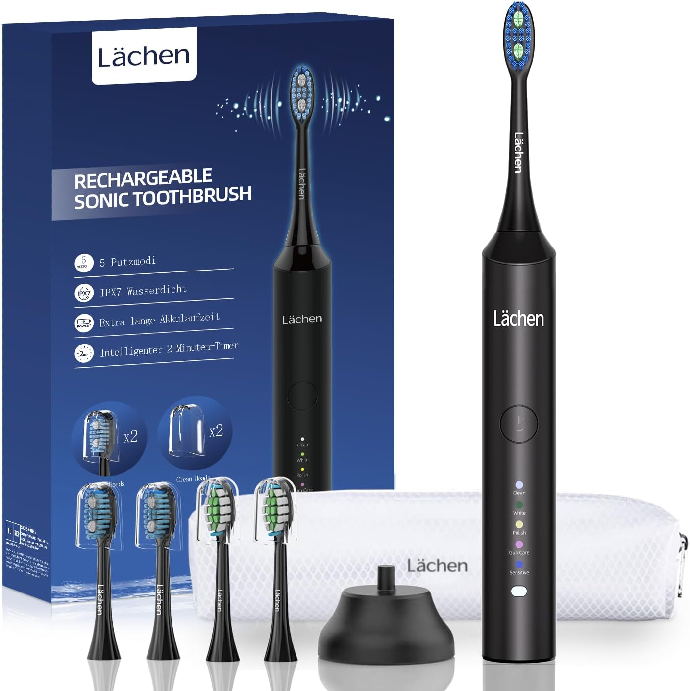Lächen Elektrische Schallzahnbürste mit 5 Reinigungsmodi, Reise-Etui & USB-Ladung (IPX7, Schwarz)