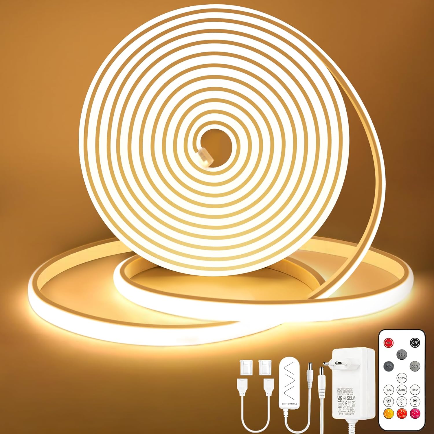 Der Lamomo COB LED Streifen 10M liefert warmweißes Licht für die Innen und Außenbeleuchtung und sorgt für gleichmäßige Ausleuchtung ohne sichtbare Lichtflecken. Dank 320 LEDs pro Meter und einem 180° Streuwinkel erzeugt das IP65-geschützte Silikonband laut Hersteller eine sehr homogene Lichtverteilung. Die mitgelieferte Fernbedienung ermöglicht stufenloses Dimmen von 0 bis 100 Prozent sowie drei Timer Einstellungen, so kannst du Beleuchtung und Stimmung aus bis zu 30 Metern steuern.