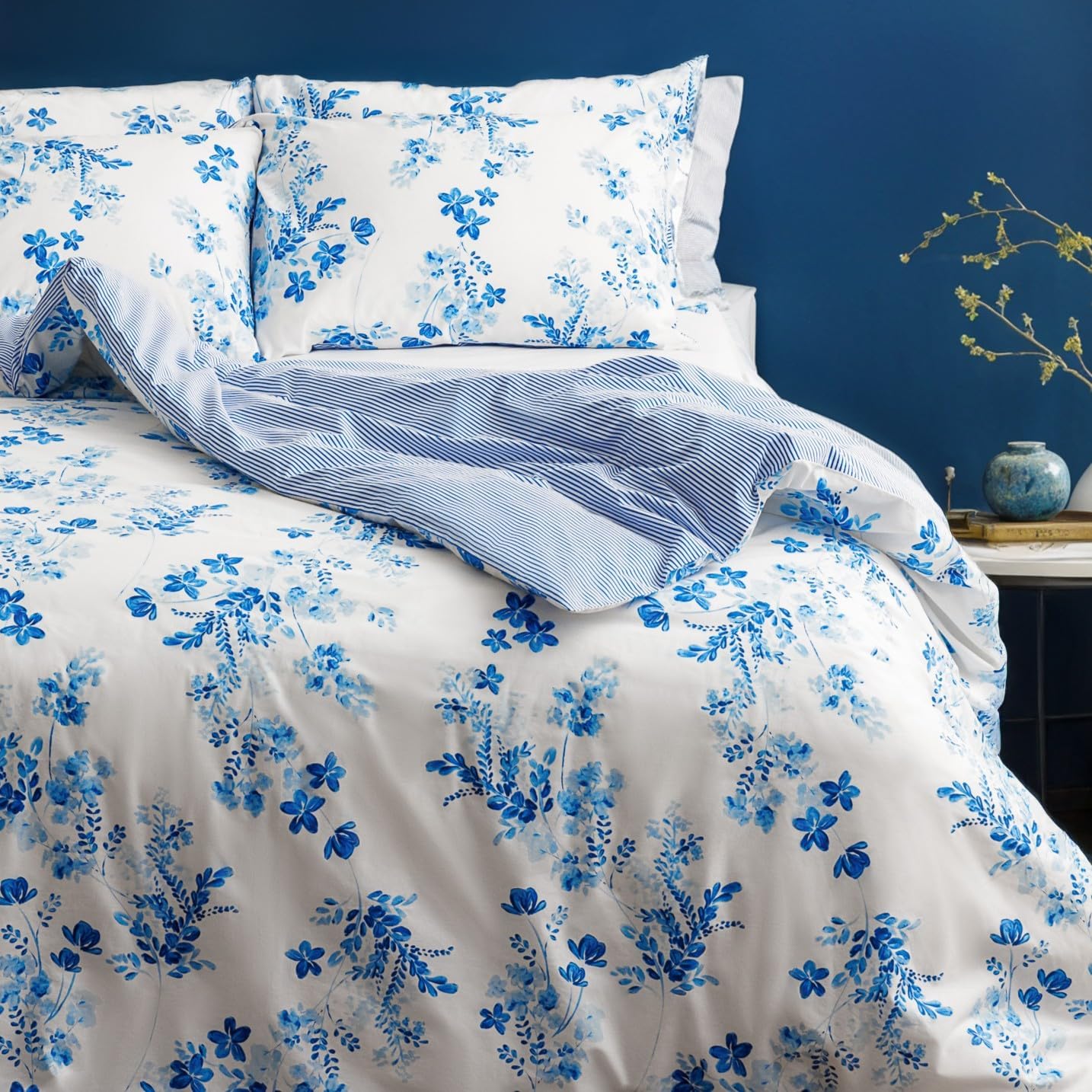 LERUUM Bettwäsche-Set Baumwolle 155x220 (Blau/Weiß gestreift & Blumen) inkl. Kissenbezug 80x80