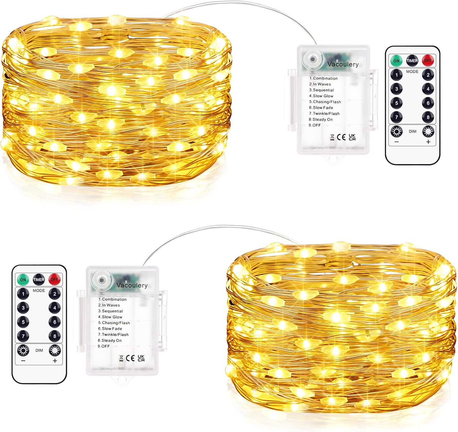 Lichterketten Batterie Timer (2 Stück) mit 10 m Kupferdraht und 100 LEDs – 8 Modi, 8 Helligkeitsstufen, IP65