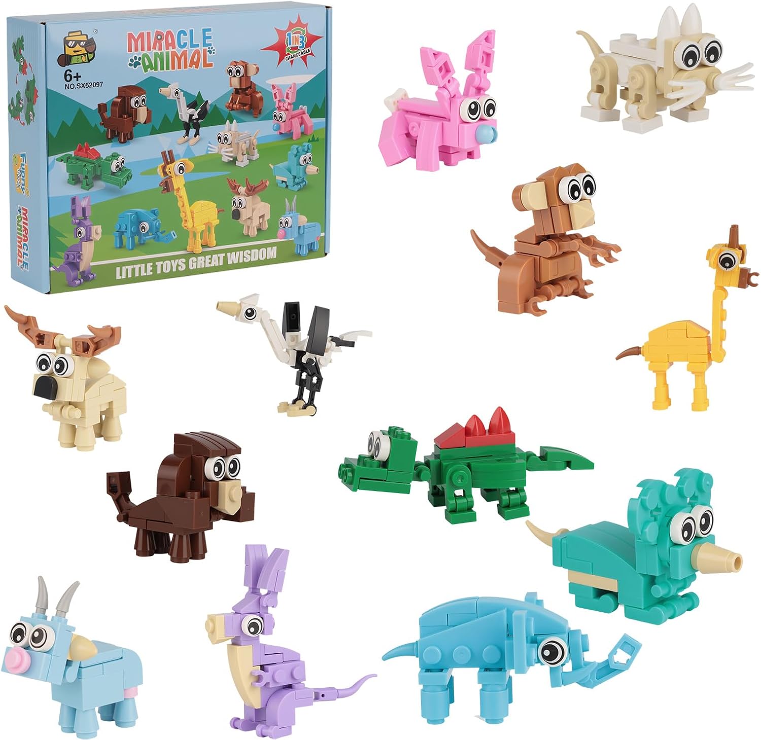 Lixstyea 12er Pack Mini Bausteine Tiere – 3-in-1 Tier-Konstruktionsspielzeug Set für Kinder ab 6 Jahren