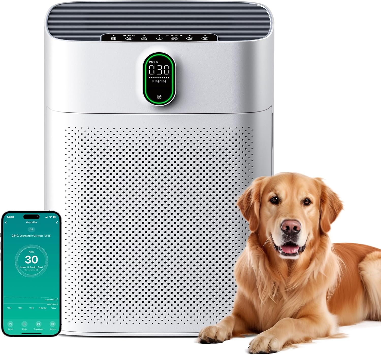 - Anzeige/Monitoring: Echtzeit-Luftqualitäts- und Filterlaufzeit