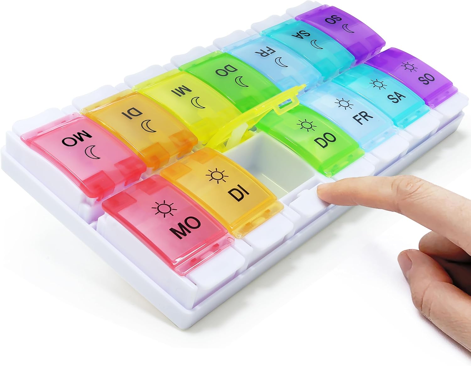 Ob für die eigene Routine oder für jemanden, der auf eine gut handhabbare Lösung angewiesen ist, hier steht Struktur im Vordergrund. Durch das transparente Design mit Regenbogenoptik siehst du den Inhalt der einzelnen Fächer direkt, ohne alles erst öffnen zu müssen. So wird das Einnehmen der Medikamente planbarer, gerade an Tagen, an denen wenig Zeit bleibt. ✨