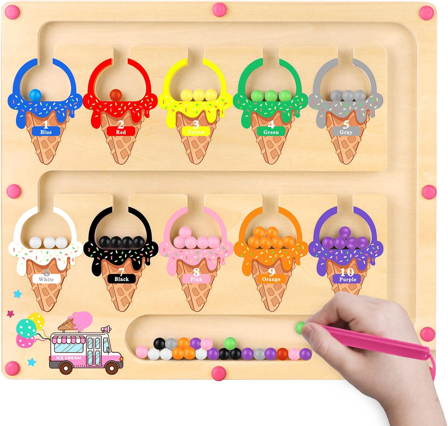 Dieses hölzerne Magnetlabyrinth von Konijiwa verbindet Zahlen- und Farberkennung mit feinmotorischem Training und ist für Kinder ab etwa 3 bis 4 Jahren konzipiert. Es zeigt bunte Eisformen mit den Zahlen 1 bis 10, sodass Kinder mithilfe eines Magnetstifts die passenden Kugeln in die entsprechenden Felder bewegen und dabei Zählen sowie Farbzuordnung üben.