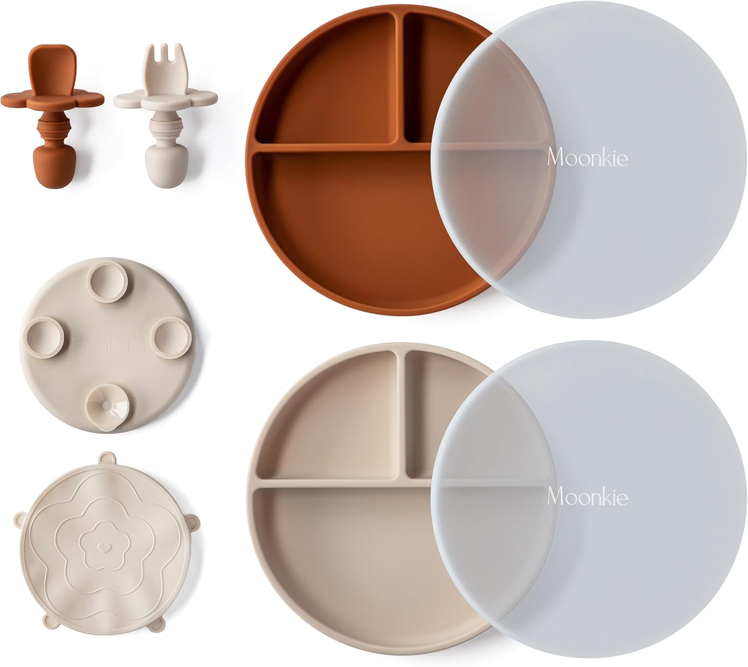 Moonkie 2-teilige Silikon-Kinderteller mit Deckel, Saugnapf-Baby-Teller-Set inkl. Gabel & Löffel (BPA-frei)