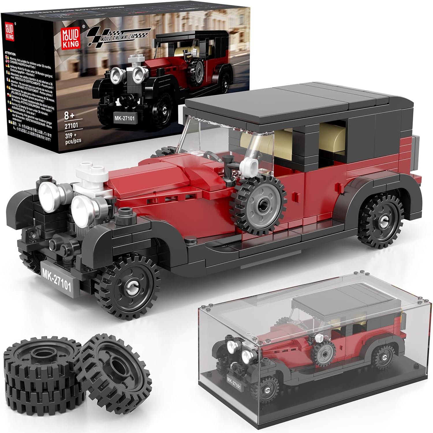 Mould King 27101 Technik Speed Champion Luxus Oldtimer – 319-teiliger Supersportwagen-Bausteinbausatz mit Acryl-Vitrine