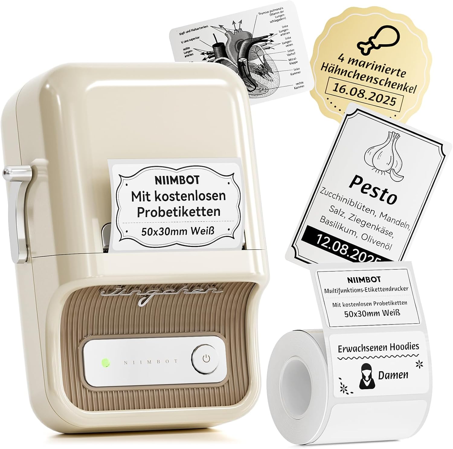 Druckbreiten von 20–50 mm ermöglichen verschiedene Anwendungen – Texte, Bilder, Barcodes, Tabellen oder sogar Formen. Das reicht vom Beschriften von Vorratsdosen und Ordnern im Büro bis zu Schmuckstücken im Scrapbooking oder personalisierten Geschenken.