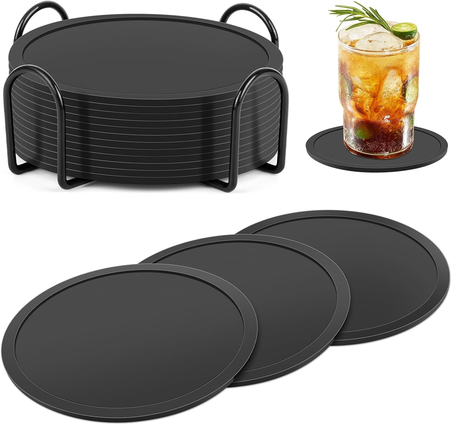 Pesutei 12er Set Glas-Untersetzer aus Silikon (10 cm) mit Edelstahlständer – schwarz, rutschfest und isolierend