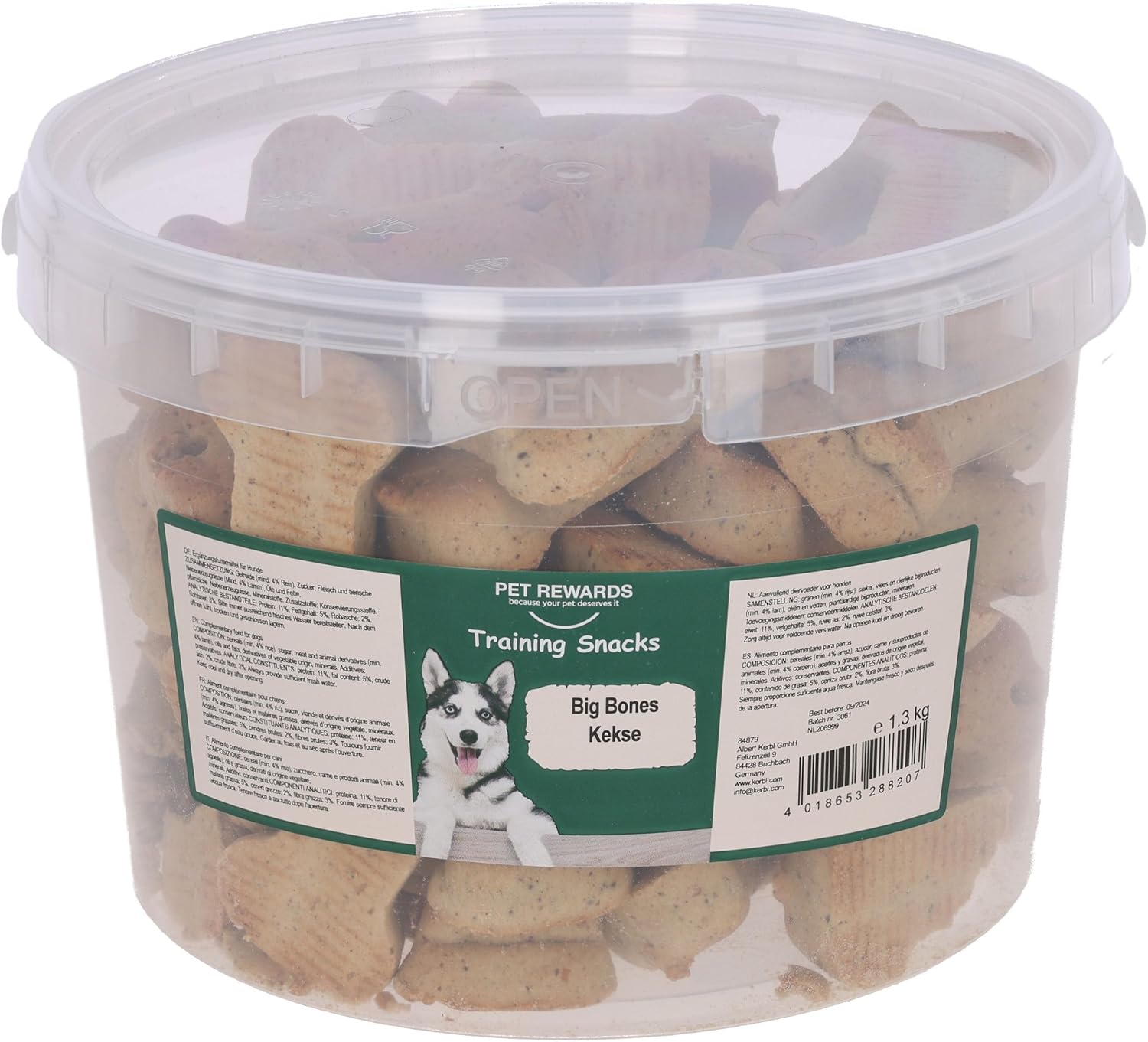 Pet Rewards Big Bones sind knusprig gebackene Hundekekse, die vor allem als Belohnung zwischendurch und fürs Training gedacht sind. Der praktische Punkt: Du bekommst sie in einem wiederverschließbaren Eimer, was den Alltag leichter macht, wenn der Hund mehrmals am Tag motiviert werden soll.