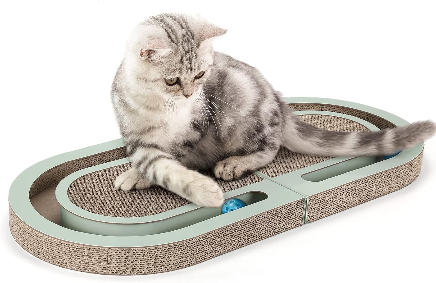PETTOM Kratzbrett für Katzen mit Trackball (66 × 30 cm) – doppelseitige Kratzpappe, faltbar