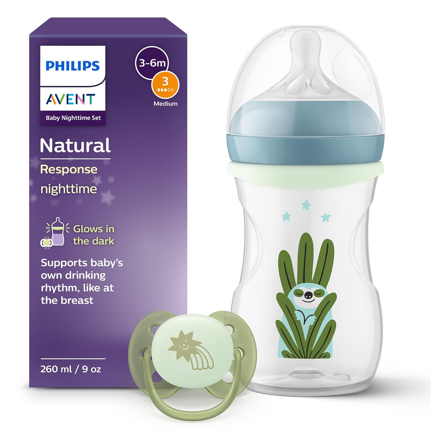 - Name: Philips Avent Natural Response Set für die Nacht – 260 ml Babyflasche mit mittlerer Durchflussrate (Mittel 3), im Dunklen leuchtender Ring, ultra soft Schnuller, Motiv müdes Faultier, SCD838/17