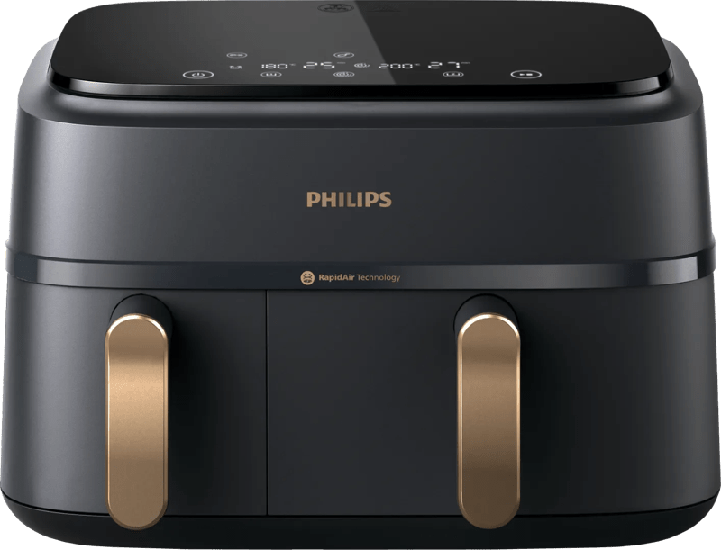 Dieses kompakte Küchengerät ermöglicht gleichzeitig das Backen von Gemüse und Grillen von Lachs dank seiner beiden Garschubladen. Mit einem einfachen Knopfdruck wählst du das passende Programm, während die RapidAir Plus Technologie heiße Luft gleichmäßig verteilt. Dadurch musst du deine Speisen weniger häufig schütteln und kannst dich auf den Timer verlassen, sodass beide Gerichte gleichzeitig fertig sind.