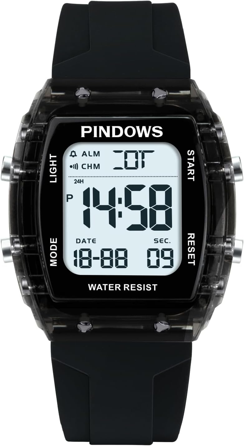 PINDOWS Digitale Sportuhr für Damen mit transparentem Gehäuse, LED-Licht, 5-ATM Wasserschutz und Stoppuhr-Alarm