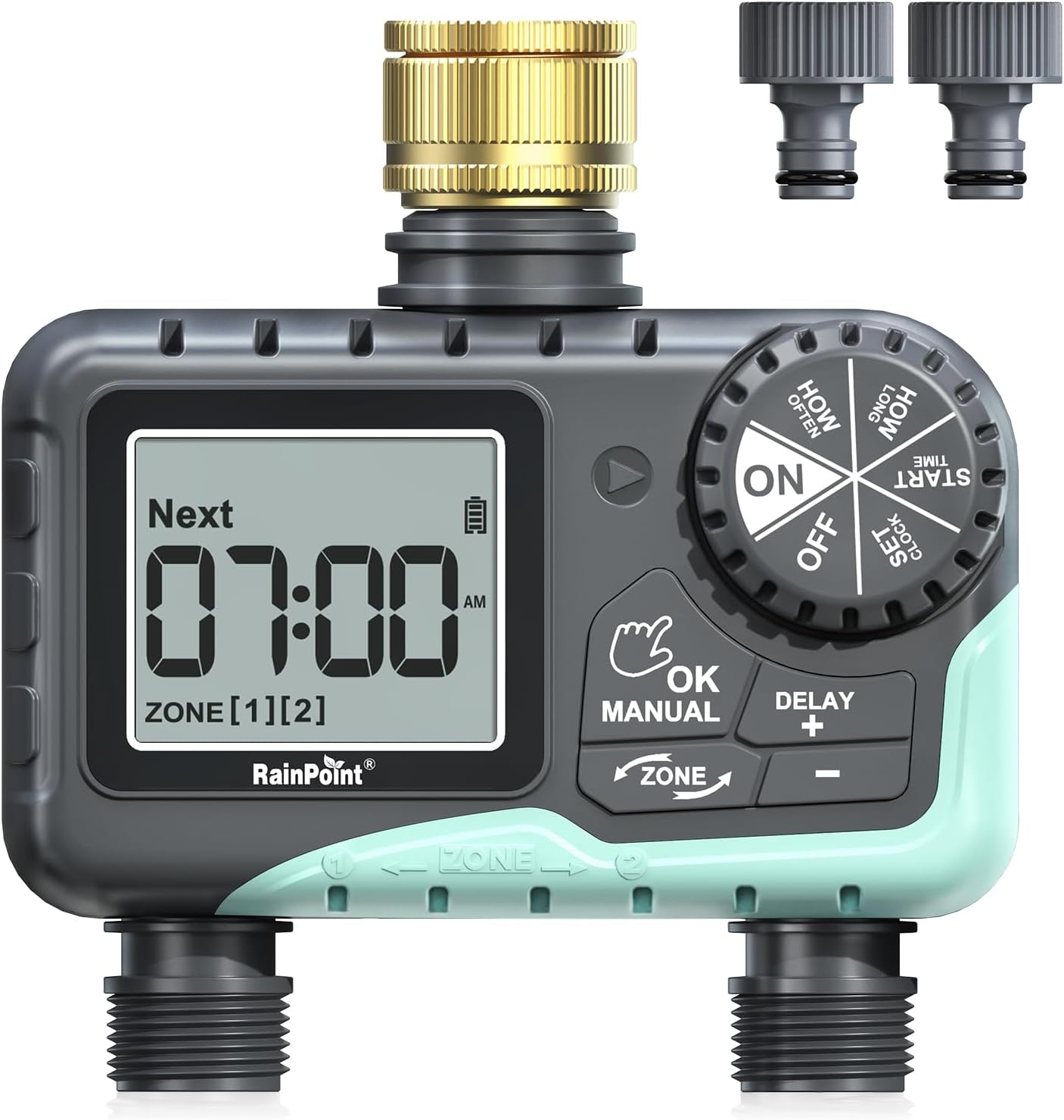 Der RAINPOINT Bewässerungscomputer „2“ ist ein programmierbarer Zeitschaltuhr-Timer für die Bewässerung über einen Wasserhahn – mit gleich zwei unabhängigen Ausgängen. Damit kannst du zwei Bereiche (z. B. unterschiedliche Zonen im Garten oder Rasen/Beete) getrennt steuern, ohne jedes Mal manuell nachjustieren zu müssen.
