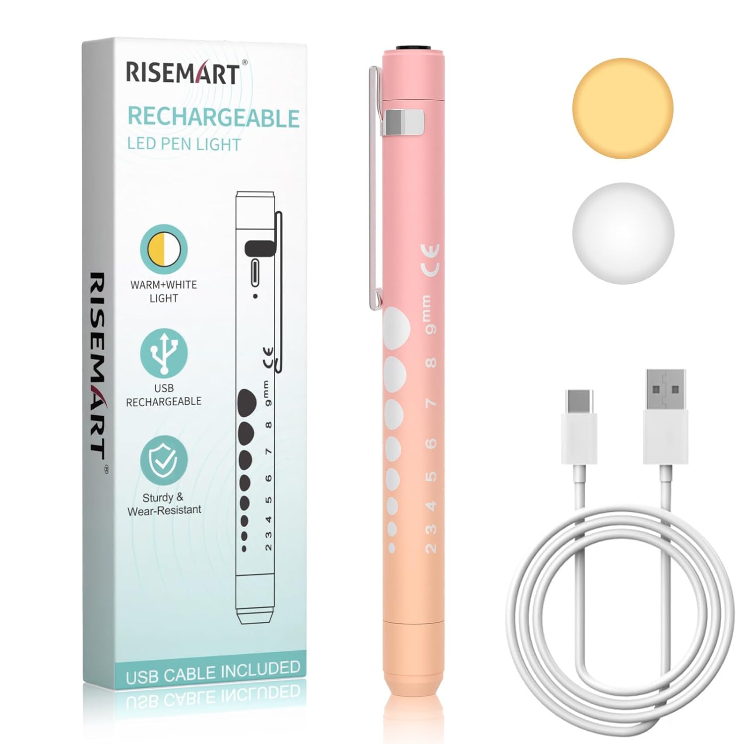 RISEMART Pupillenleuchte mit Pupillenmessgerät & Lineal – USB-aufladbare LED-Stiftlampe (warm/kalt weiß)