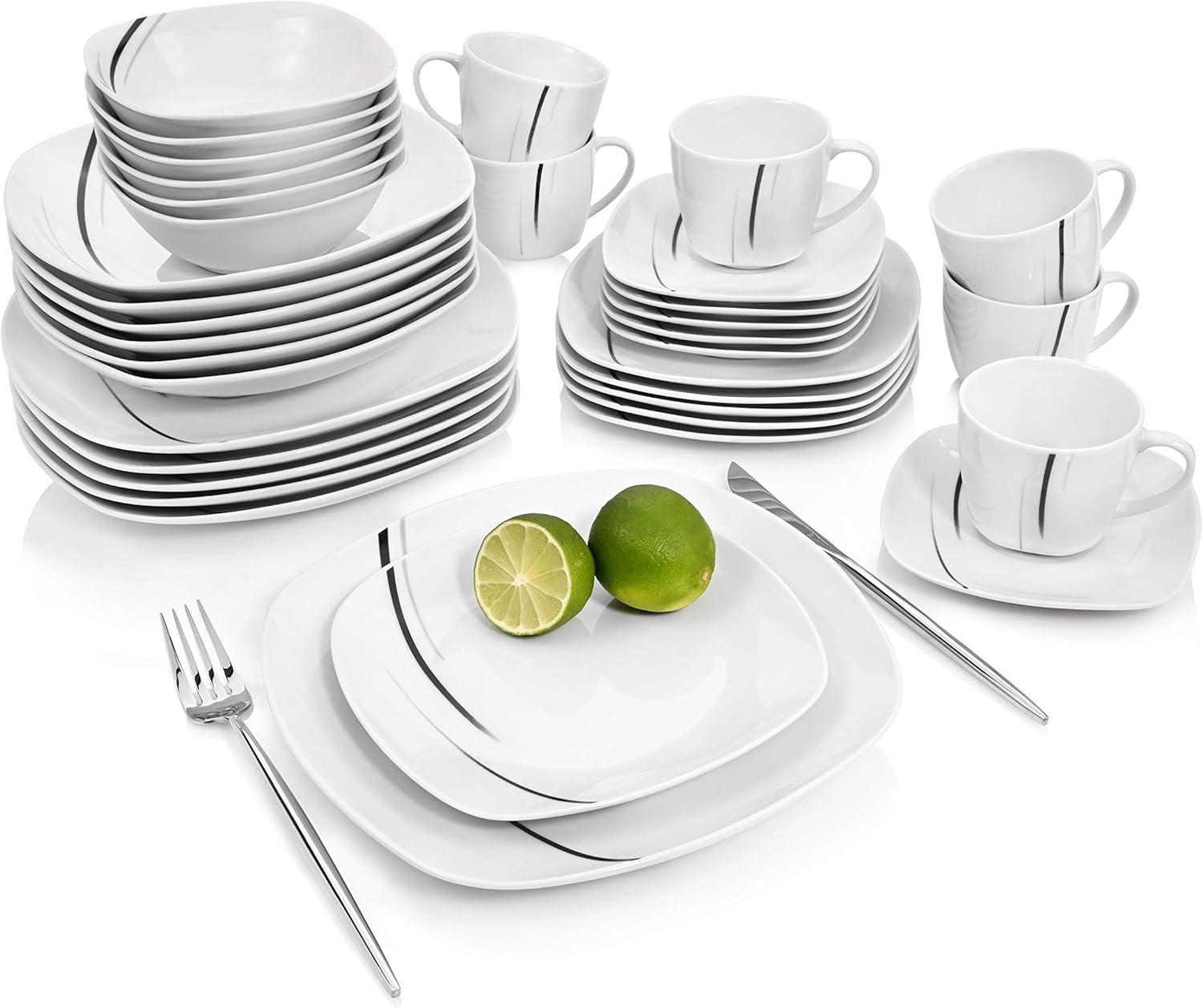 Aus der Produktbeschreibung sind vor allem diese Fakten relevant: - Material der Teller: Porzellan - Set-Größe: 36-teilig - Personenanzahl: für 6 Personen - Dekor/Optik: schwarze Linien, abgerundete Ecken