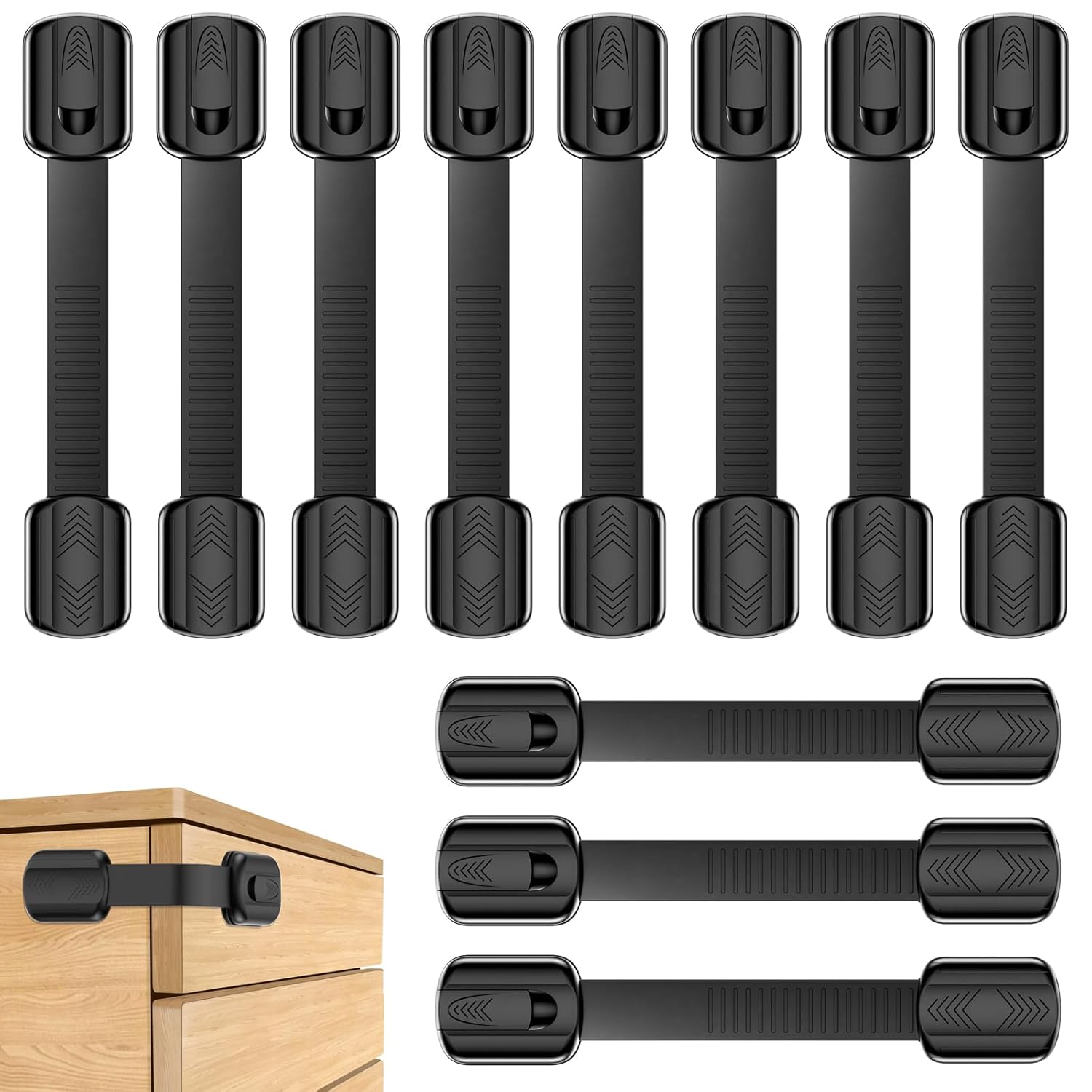 Die Sicherungen kommen als Set mit 10 Stück und sind als multifunktionale Kindersicherung für verschiedene Bereiche beschrieben: Schrank, Kühlschrank, Türschränke, Fenster, Kommode sowie weitere Möbel- und Haushaltsbereiche wie Küche, Waschmaschine oder Trockner. Die Kunststoffbänder sind laut Beschreibung verstellbar und sollen sich an unterschiedlichen Ecken anbringen lassen – sowohl an flachen als auch an runden Kanten.