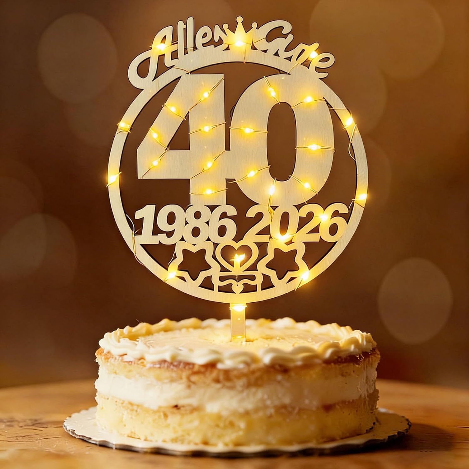 Dieser Holz-Cake Topper kombiniert persönliche Jahreszahlen und stimmungsvolle LEDs für Dekorationen zum 40. Geburtstag oder Jubiläum. Er schafft sofort Atmosphäre und passt auf klassische runde und rechteckige Kuchen, wenn du einen Blickfang suchst.