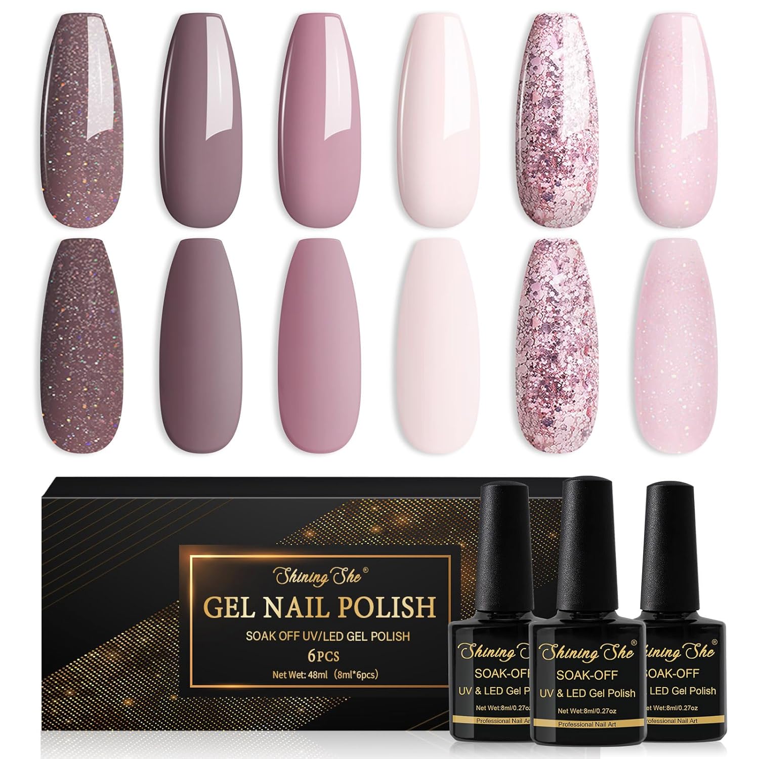 Shining She UV-Nagellack-Set mit 6 Farben (Glitzer & Nude), 8 ml pro Flasche – für DIY Nailart zu Hause