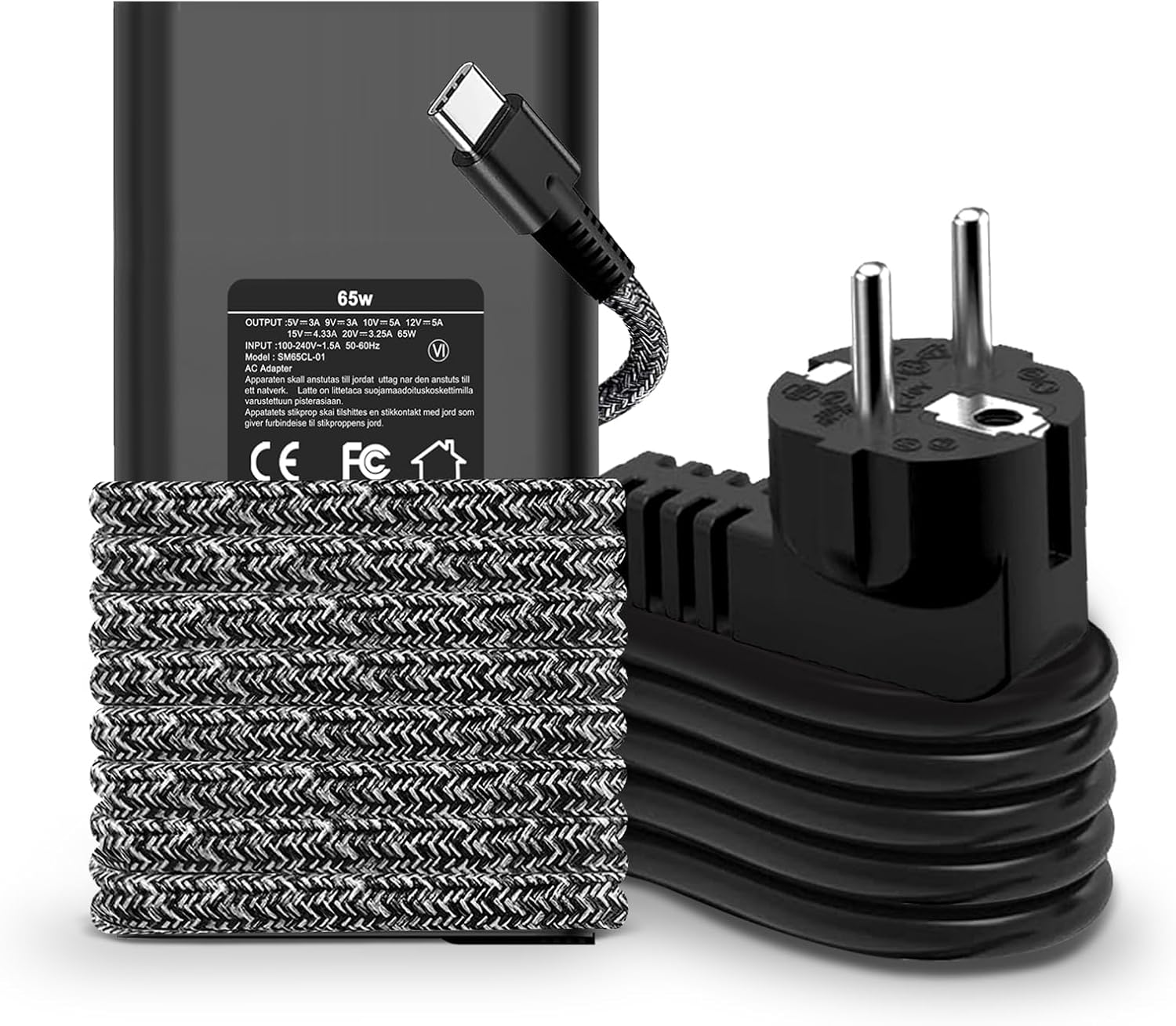 Bei der Leistung und den elektrischen Eckdaten bleibt das Ladegerät relativ klar: Es arbeitet mit 100–240V Eingang (50–60Hz) und liefert über USB‑C Ausgangsoptionen von 5V/9V/15V/20V. Dabei werden je nach Spannung unterschiedliche Ströme genannt (5V/9V/15V/20V bei 1A/3,25A, insgesamt maximal 65W). Für die Praxis heißt das: Es ist kein „irgendein“ Ladeadapter, sondern ein 65W-Netzteil, das mehrere Leistungsstufen abdecken soll.