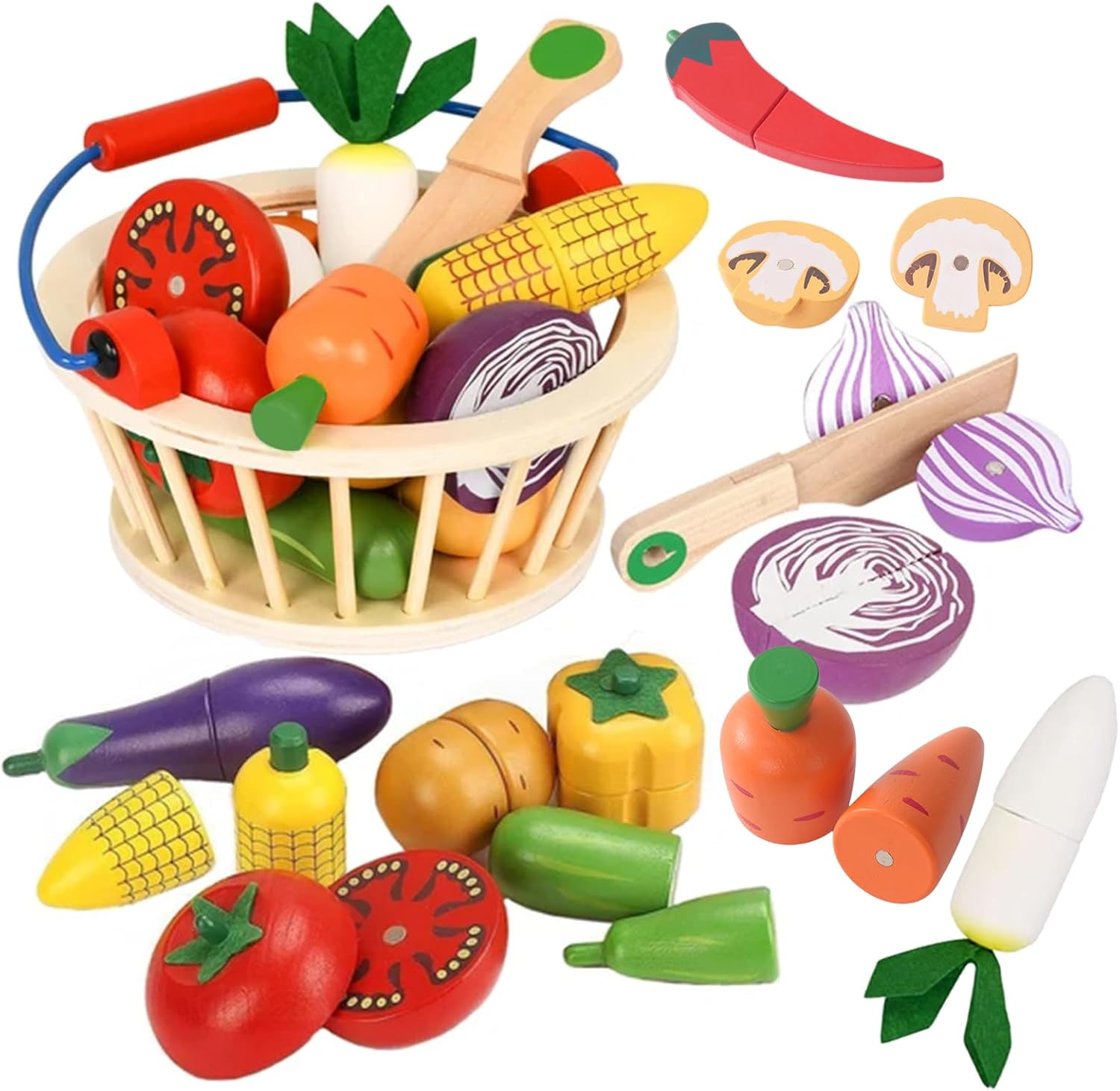 Dieses Holz Gemüse-Spielset begleitet kleine Köche beim Rollenspiel in der Spielküche. Es fördert Kreativität, Sprachentwicklung und Feinmotorik auf spielerische Weise, während Kinder lernen, Obst und Gemüse kennenzulernen und gesunde Ernährung zu verstehen. Das Set enthält eine bunte Auswahl an Gemüsearten, ein stabiler Korb zum Aufbewahren und einen kindgerechten Holzmesser, mit dem das Schneiden simuliert wird. Durch die robuste Verarbeitung und die wasserbasierte Farbe ist das Spielzeug sicher und langlebig, ideal für Kinder ab 3 Jahren. Die Teile sind sauber verarbeitet und haben keine scharfen Kanten, so macht das Spielen Spaß und sorgt für Sicherheit beim Lernen durch Nachahmung. In diesem Set steckt echter Lernwert, denn rollenspielbasierte Küchenaktivitäten fördern soziale Interaktion, Fantasie und Sprachfähigkeiten in einer vertrauten, familienfreundlichen Umgebung 🎨🪵.