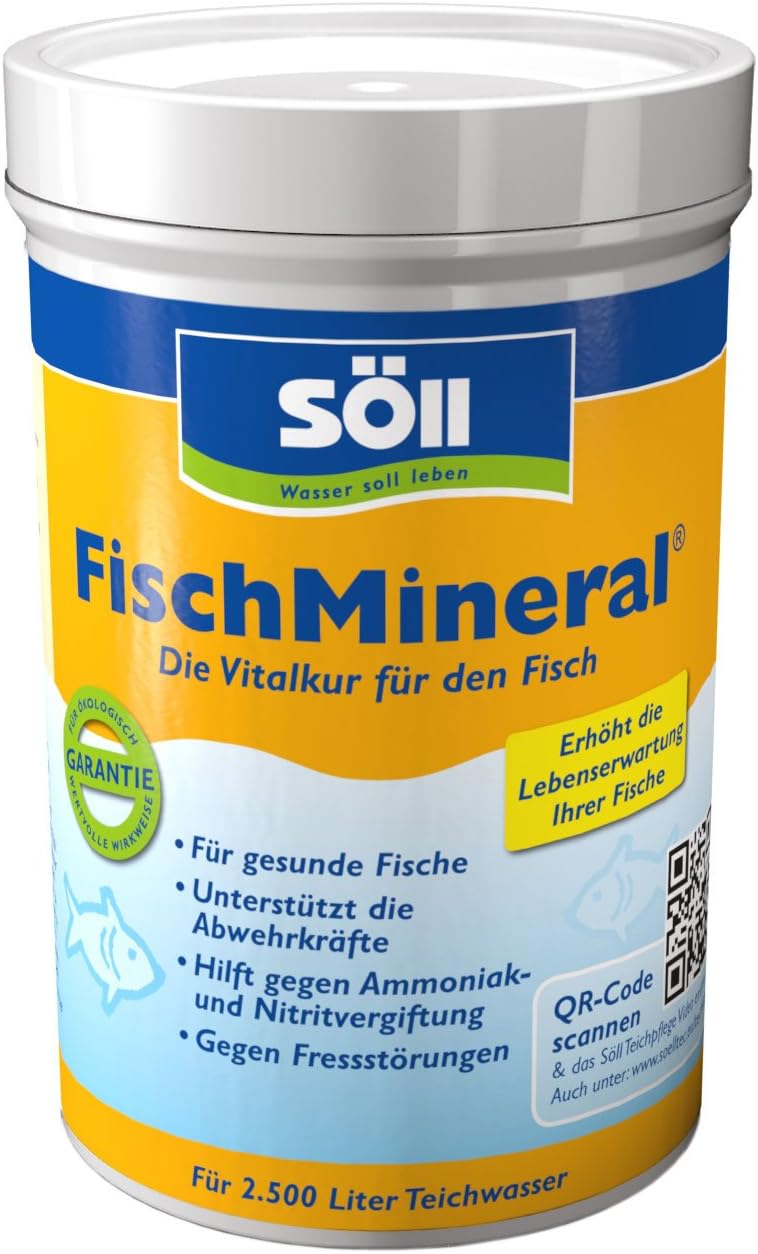 FischMineral 250 g von Söll ist ein Teichpflegemittel in Pulverform, das laut Hersteller für die Unterstützung gesunder Fische gedacht ist. Im Kern geht es um drei Dinge: Schadstoffe im Teichwasser beeinflussen, die Wasserwerte stabilisieren und die Versorgung mit Mineralstoffen sowie Spurenelementen ergänzen. Das Produkt zielt dabei speziell auf den Nutzen für Fische wie Koi und Goldfische ab.
