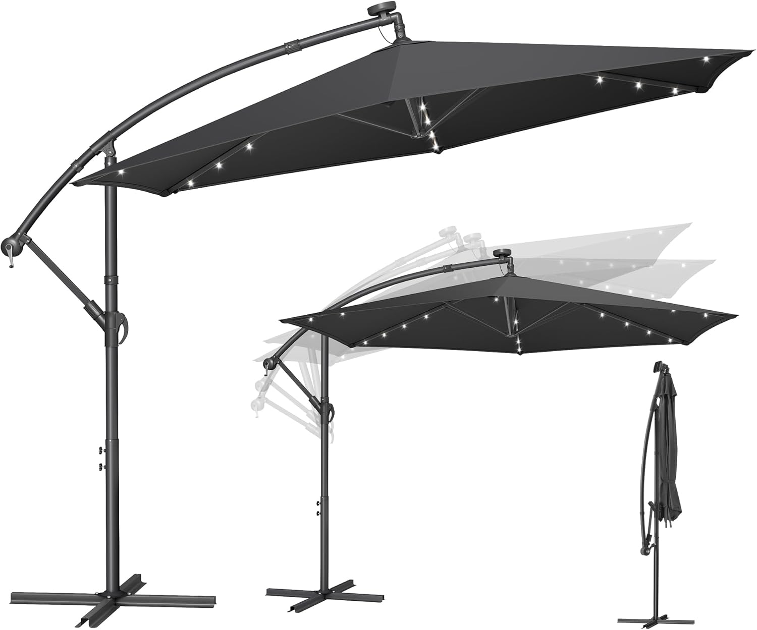 SONGMICS Ampelschirm 350 cm mit LED-Solar-Beleuchtung, 32 LEDs, UPF 50+, Kurbel und Ständer (grau) GPU119GZ01