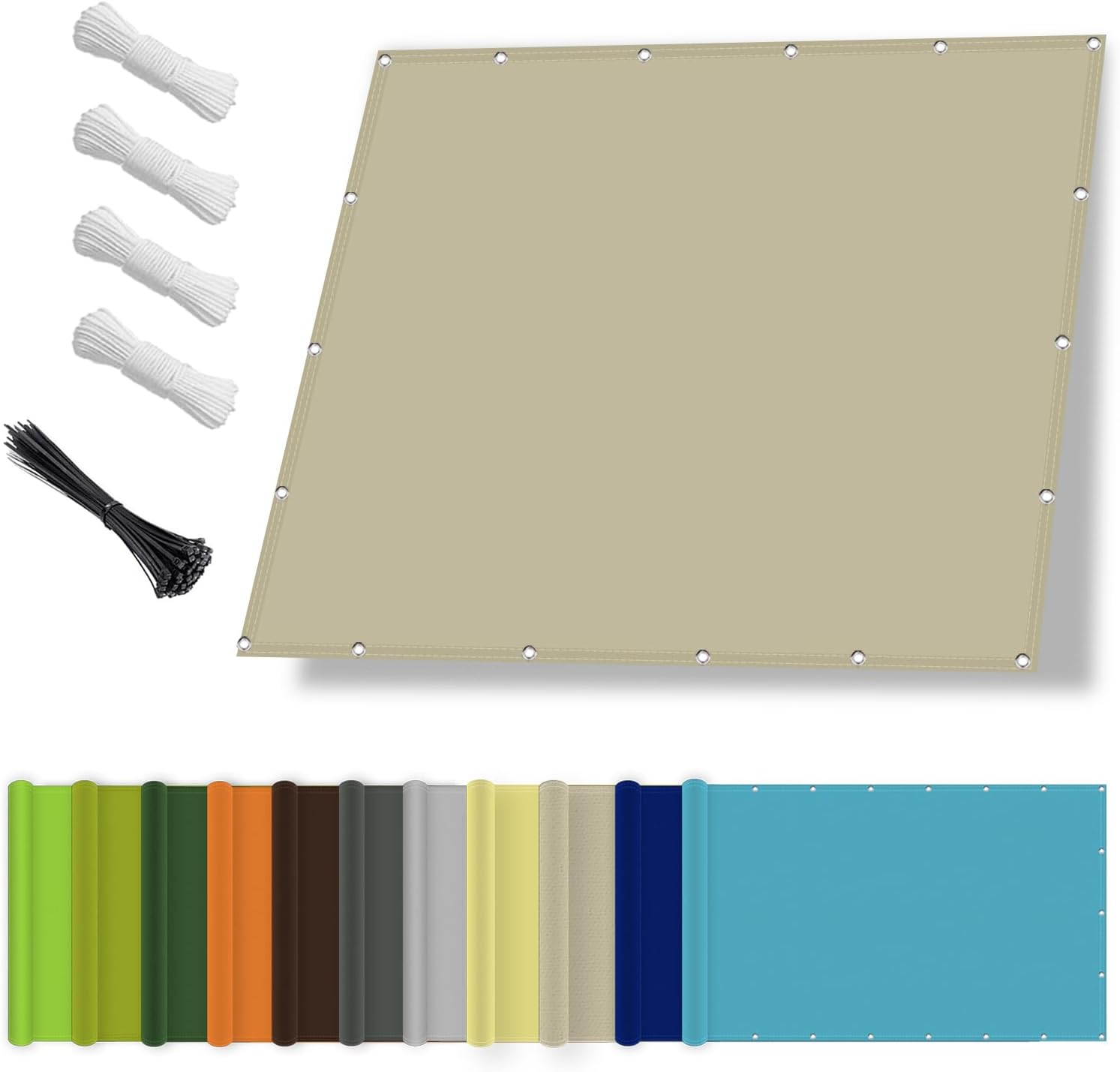Laut Beschreibung ist eine schnelle Montage möglich, und es werden Spannseile sowie rostfreie Stahl-Ösen genannt. Außerdem wird erwähnt, dass das Produkt nach Maß zugeschnitten sein kann (mit Anpassungsservice für individuelle Größen, Farben und Lochabstände). Ob und welche Varianten du im konkreten Angebot vorfindest, solltest du vor der Bestellung im Detail prüfen.