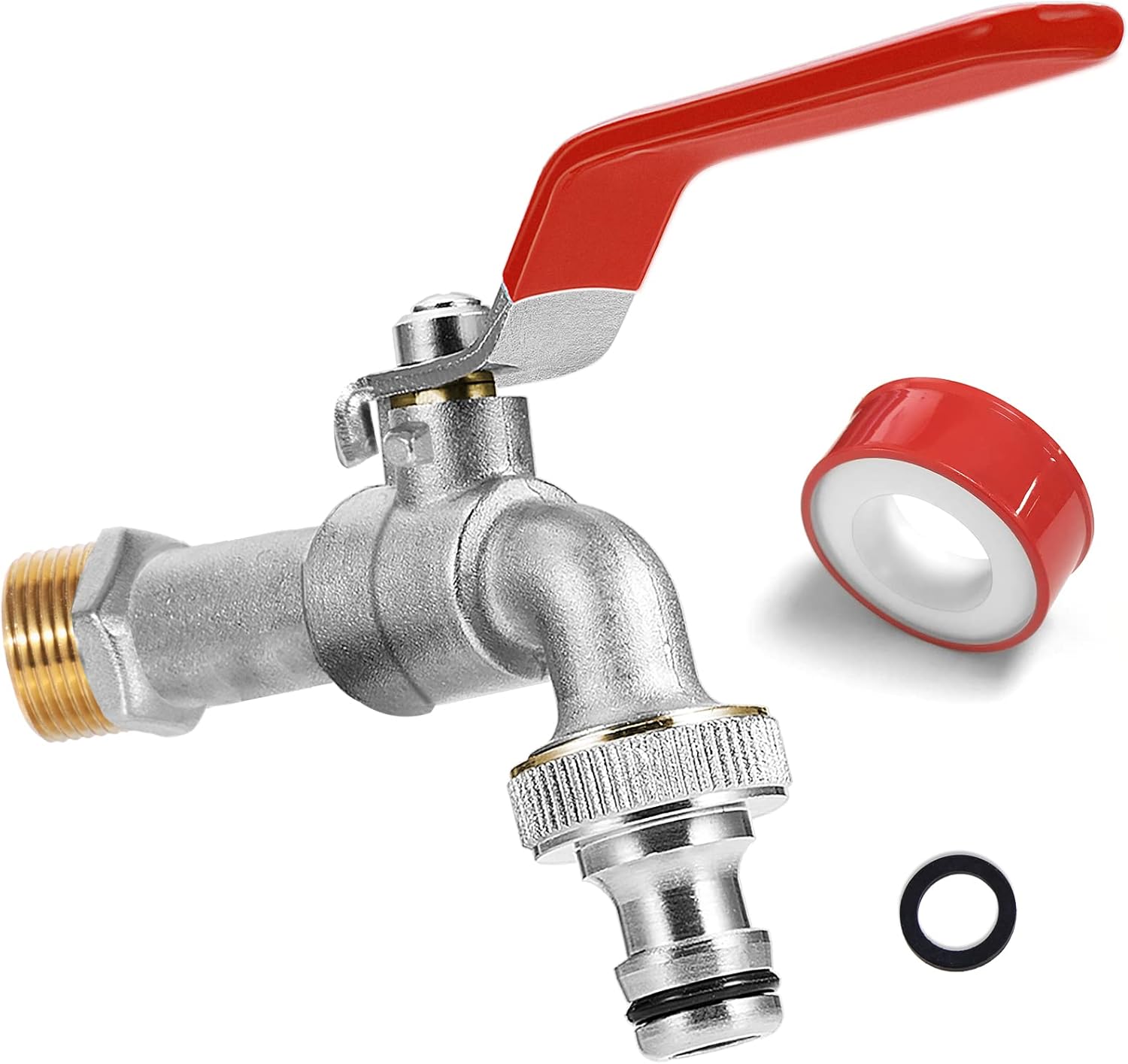 Der Wasserhahn wird als Außen-Gartenhahn mit Schlauchanschluss beschrieben. Er kommt mit einem „Rollendichtband“ (Standardgröße) sowie einer Unterlegscheibe. Der angegebene Einlass und Auslass liegt jeweils bei 3/4 Zoll (26,44 mm). Der Zusammenbau soll laut Hersteller/Produktbeschreibung schnell und unkompliziert sein.