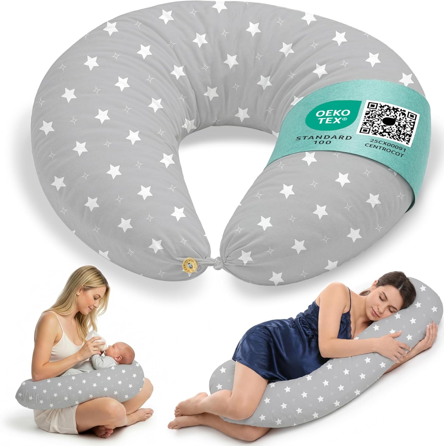 Besonders stimmig wirkt der Ansatz „Mehrfachnutzung“: Schwangerschaft (Seitenlage), Stillen (Haltungsstütze) und Babyzeit (Tummy Time). Dafür wird das Kissen über einen robusten Knopf zusammengeschlossen, wodurch es sich in verschiedene Nutzungsformen bringen lässt. Wenn du ein Kissen suchst, das nicht nur in einer Phase „funktioniert“, ist dieser Gedanke interessant.