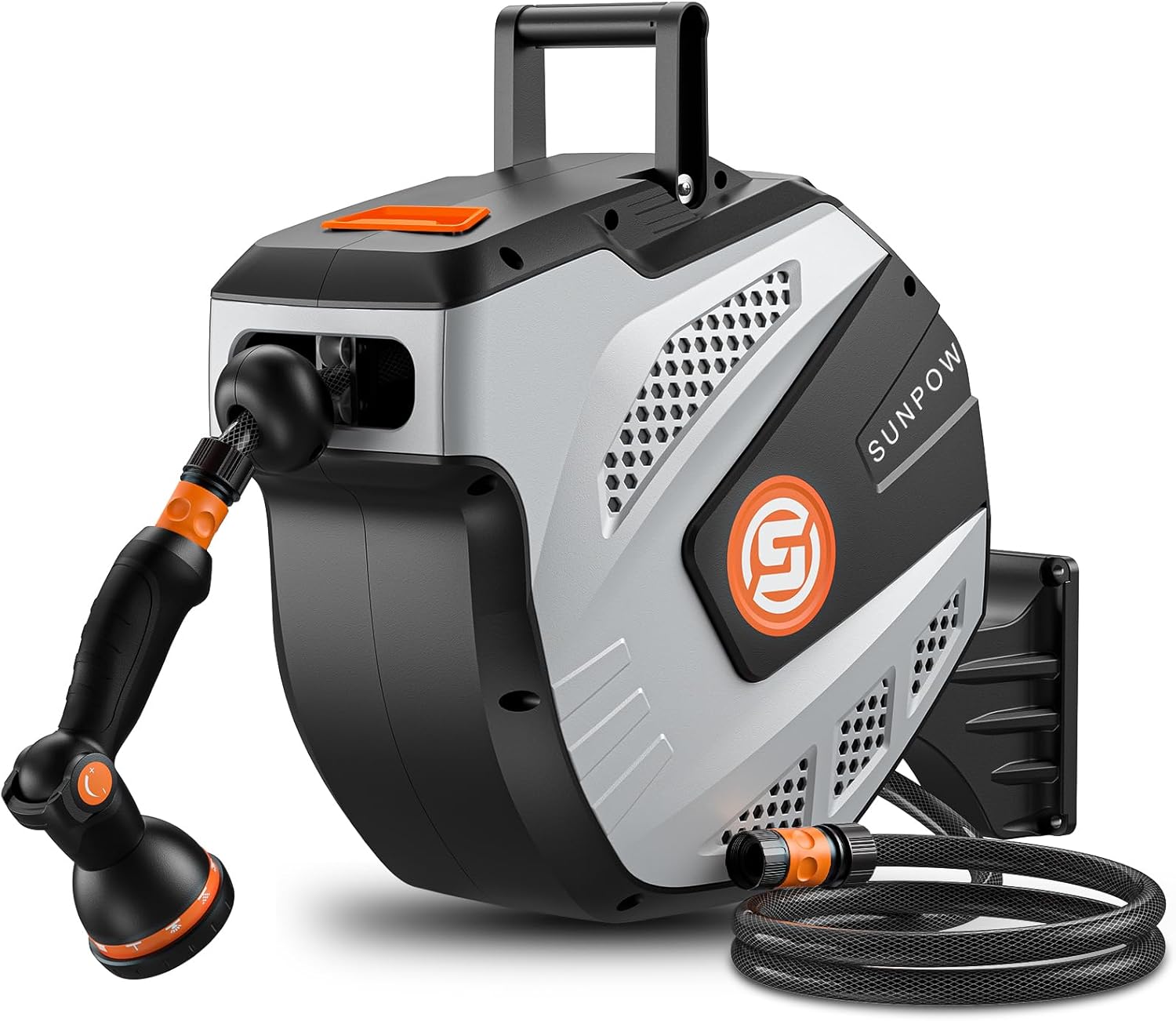 SUNPOW Wand-Schlauchbox RollUp 35 m – Schlauchtrommel mit 10-fach Sprühdüse, 180° schwenkbar & Auto-Rewind