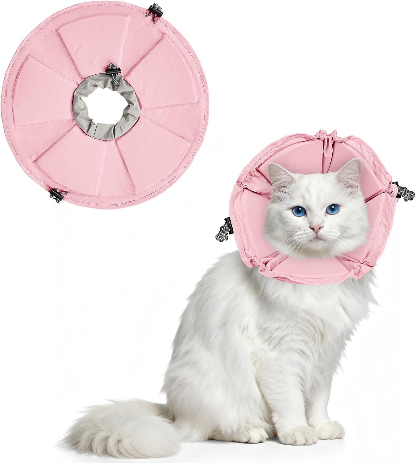 Die Halskrause ist verstellbar, was grundsätzlich ein Vorteil ist: Du kannst sie besser an die Silhouette deiner Katze anpassen. Außerdem wird sie in der Farbe „Rosa Blume“ angeboten, was zwar optisch ist, aber in der Kaufentscheidung dennoch für manche Halter ein Plus sein kann.