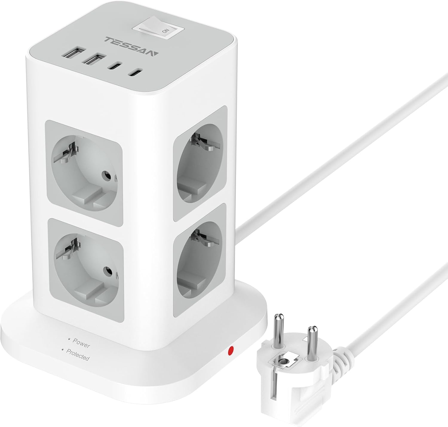 Die wichtigsten Angaben aus der Produktbeschreibung sind: - TESSAN 8-Fach Mehrfachsteckdose (Steckdosenturm) - AC-Steckdosen: 8 - USB-Ports: 4 (2× USB-C, 2× USB-A) - USB-C: 5V/3A, 15W (max.) - USB-A: 5V/2,4A, 12W (max.) - Überspannungsschutz: vorhanden (laut Beschreibung) - Schalter: integriert - Kabellänge: 2 Meter - Max. Leistung: 3600W