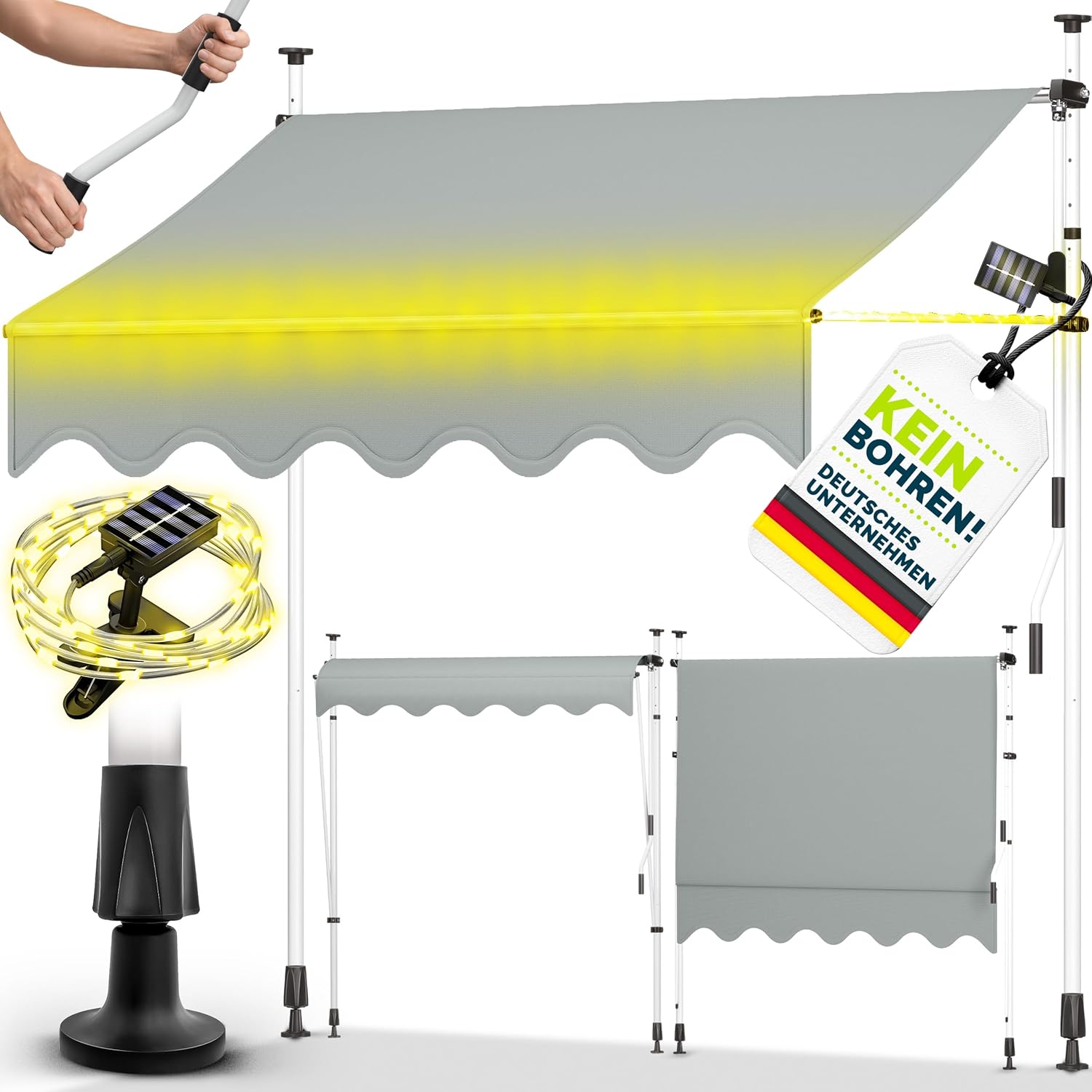 tillvex Klemmmarkise mit Handkurbel und LED-Lichterkette (ohne Bohren) für Balkon & Terrasse – Hellgrau, 400 cm