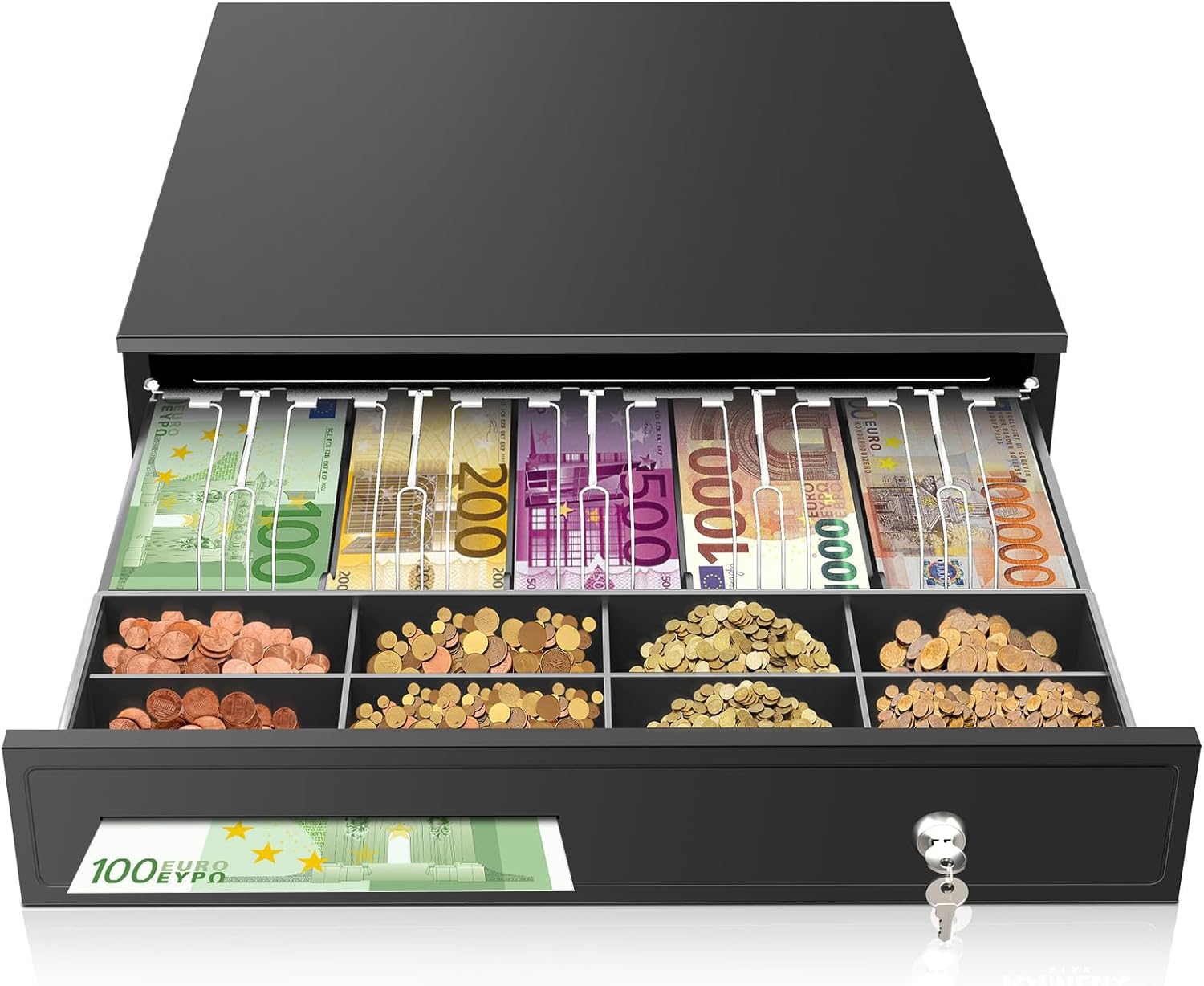 Die Tiskgg große elektrische Kassenschublade ist für Betriebe gedacht, die Bargeld schnell, ordentlich und mit klaren Öffnungsoptionen verwalten möchten. Laut Daten kommt sie mit 5 Fächern für Banknoten und 8 Fächern für Münzen, zusätzlich gibt es ein Belegfach vorne, in dem große Banknoten, Schecks und Quittungen abgelegt werden können – ohne die Schublade extra zu öffnen.