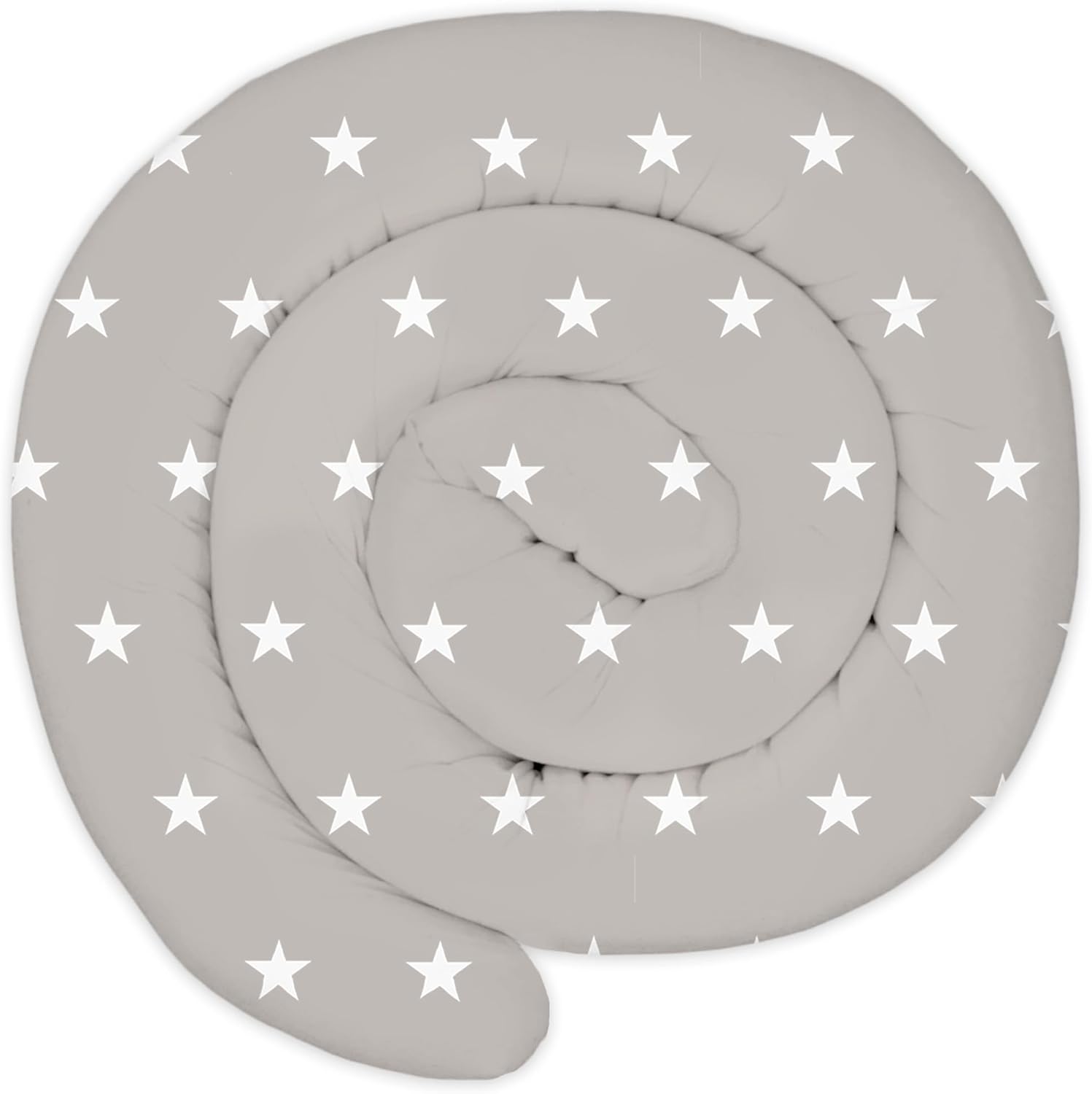 Die Bettschlange bietet eine stilvolle Umrandung für Bett, Sofa oder Stubenwagen und schafft eine gemütliche, einladende Atmosphäre im Kinderzimmer. Sie dient flexibel als Stillkissen, Spielunterstützung oder dekorative Begrenzung und passt sich verschiedenen Bettformen an. Dank der EU-Herstellung steht sie für hochwertige Verarbeitung und Langlebigkeit. Die Oberfläche aus atmungsaktiver Baumwolle in Grau mit weißen Sternen verleiht jedem Raum eine sanfte Ästhetik, während die Füllung aus stabilem Polyester für Formstabilität sorgt. Die Länge von 400 cm macht sie zu einer vielseitigen Lösung, die sich an große Betten ebenso anpasst wie an kleine Beistellbetten. Pflegeleicht ist sie zudem, da sie bei 30°C in der Maschine gewaschen werden kann und ihre Form auch nach Mehrfachwaschgängen behält.