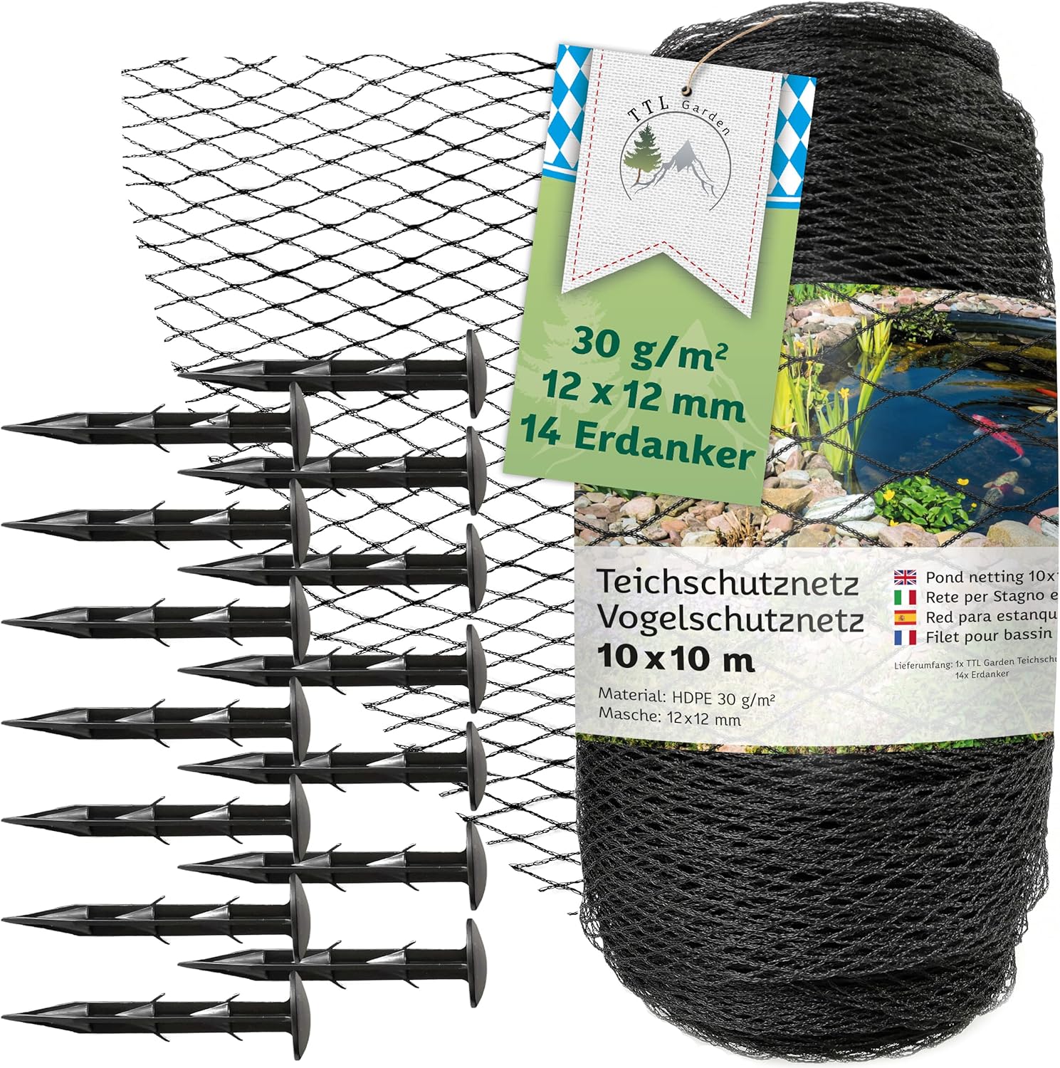 TTL GARDEN 10x10 m Teichnetz Vogelschutznetz schwarz, 30 g/m², 12x12 mm HDPE – inkl. 14 Bodenanker