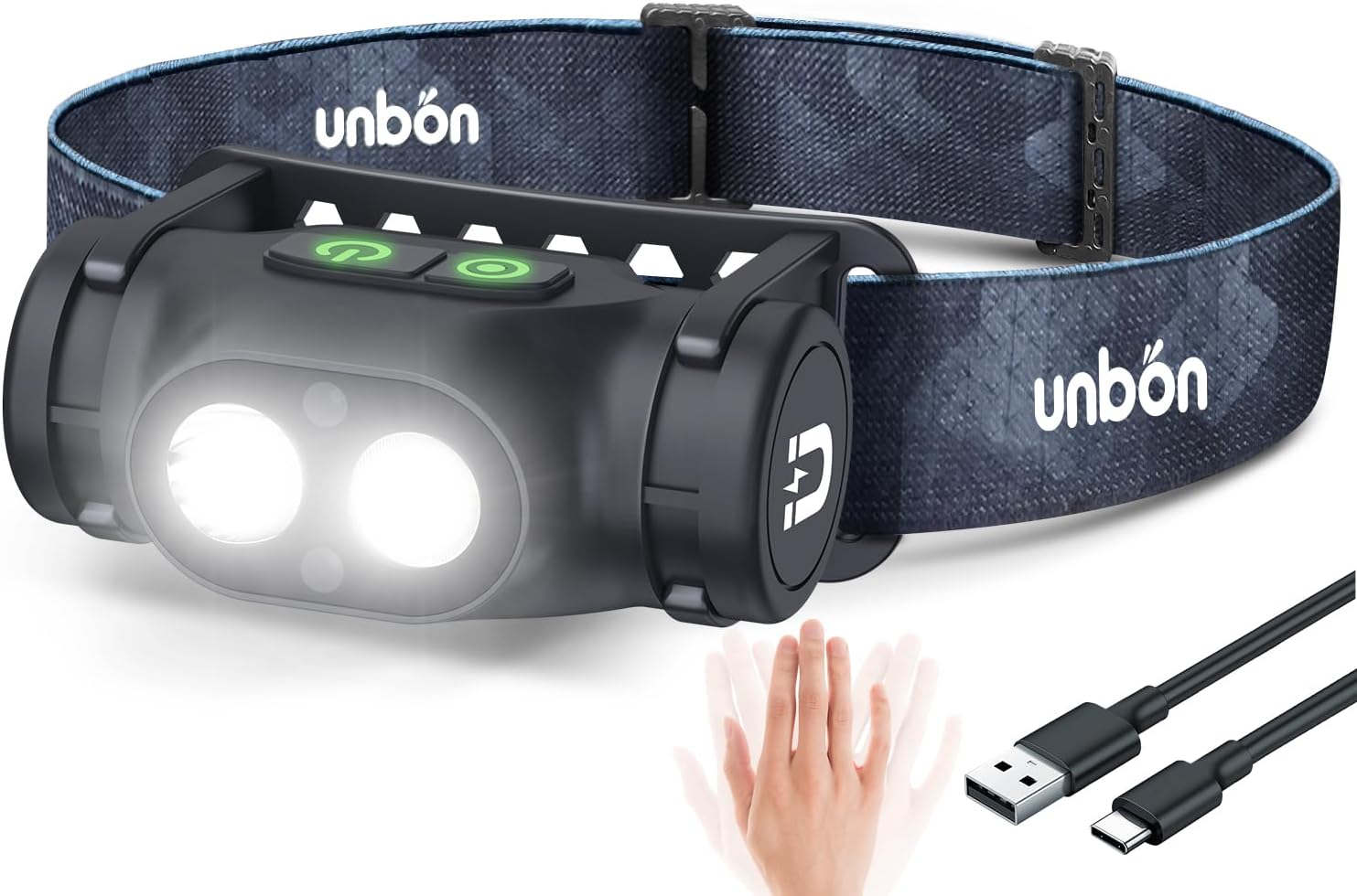 UNBON Stirnlampe LED wiederaufladbar (USB-C), extrem hell, dimmbar, Sensor & Magnet, IPX4